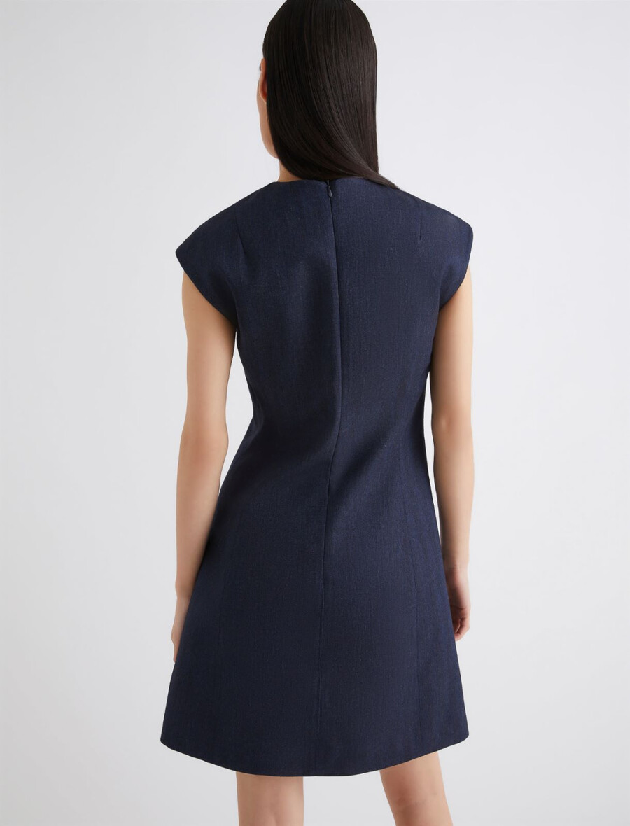 Una silhouette accentuata, lunghezza sopra il ginocchio e una texture accattivante effetto denim sono i punti focali di questo nuovo abito in lana e viscosa. Il modello fluido può essere abbinato a décolleté e pochette per un look da giorno ultra versatile.