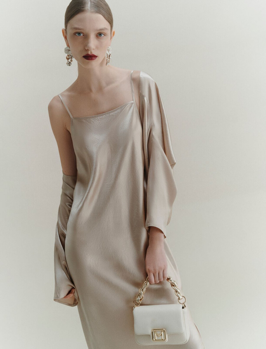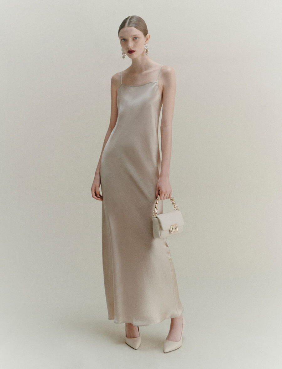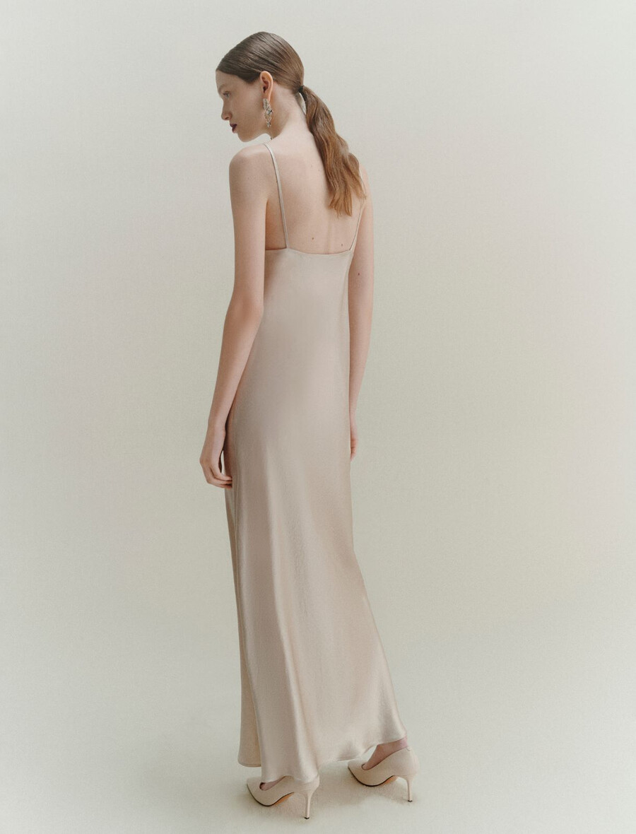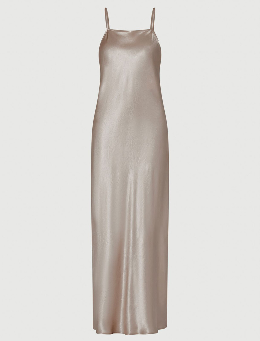Serate fuori, cocktail party o eventi? Tutto è possibile con questo abito sottoveste in raso: vanta una vestibilità semplice e un taglio sbieco aderente per accompagnarti da una sera all’altra con grazia incrollabile.