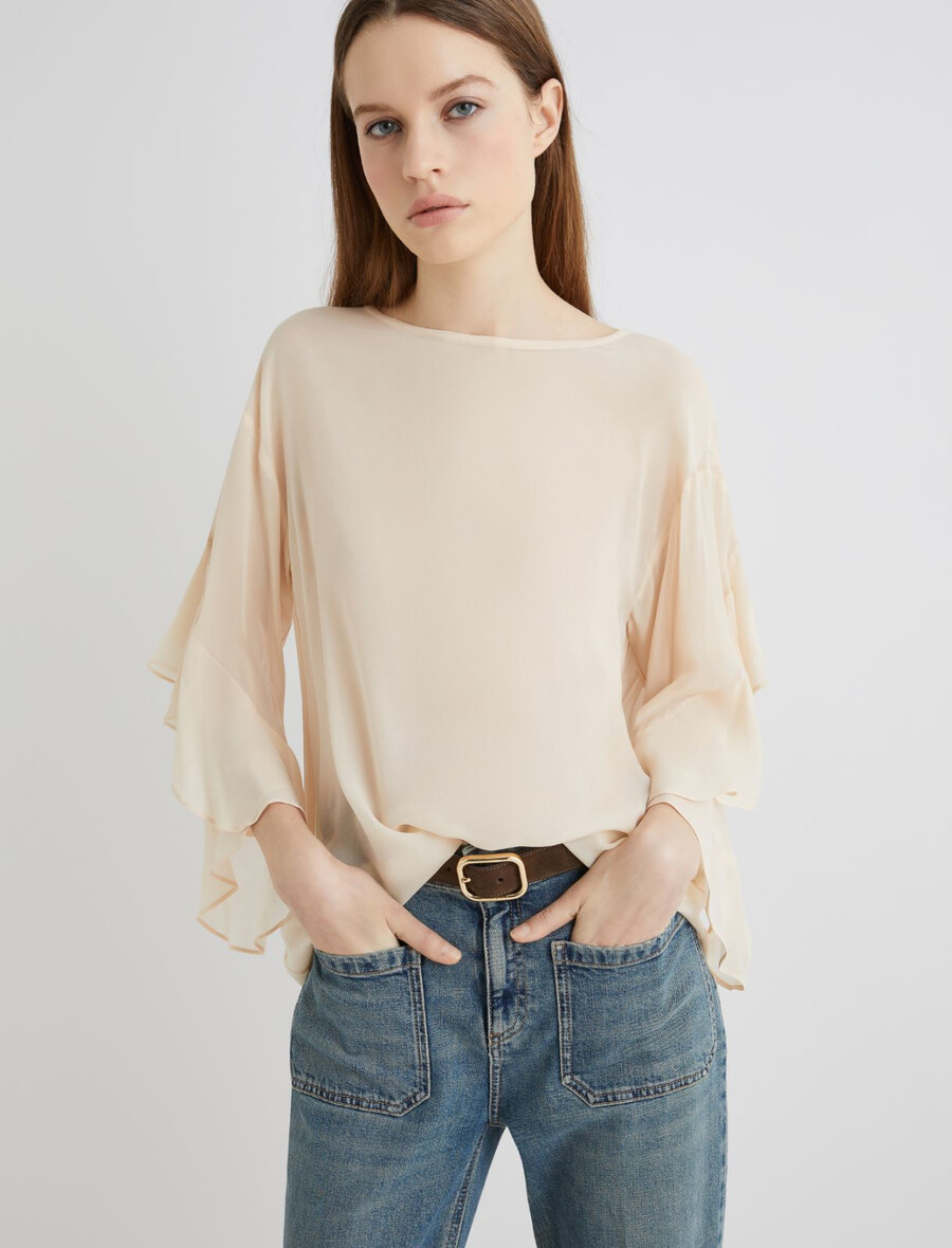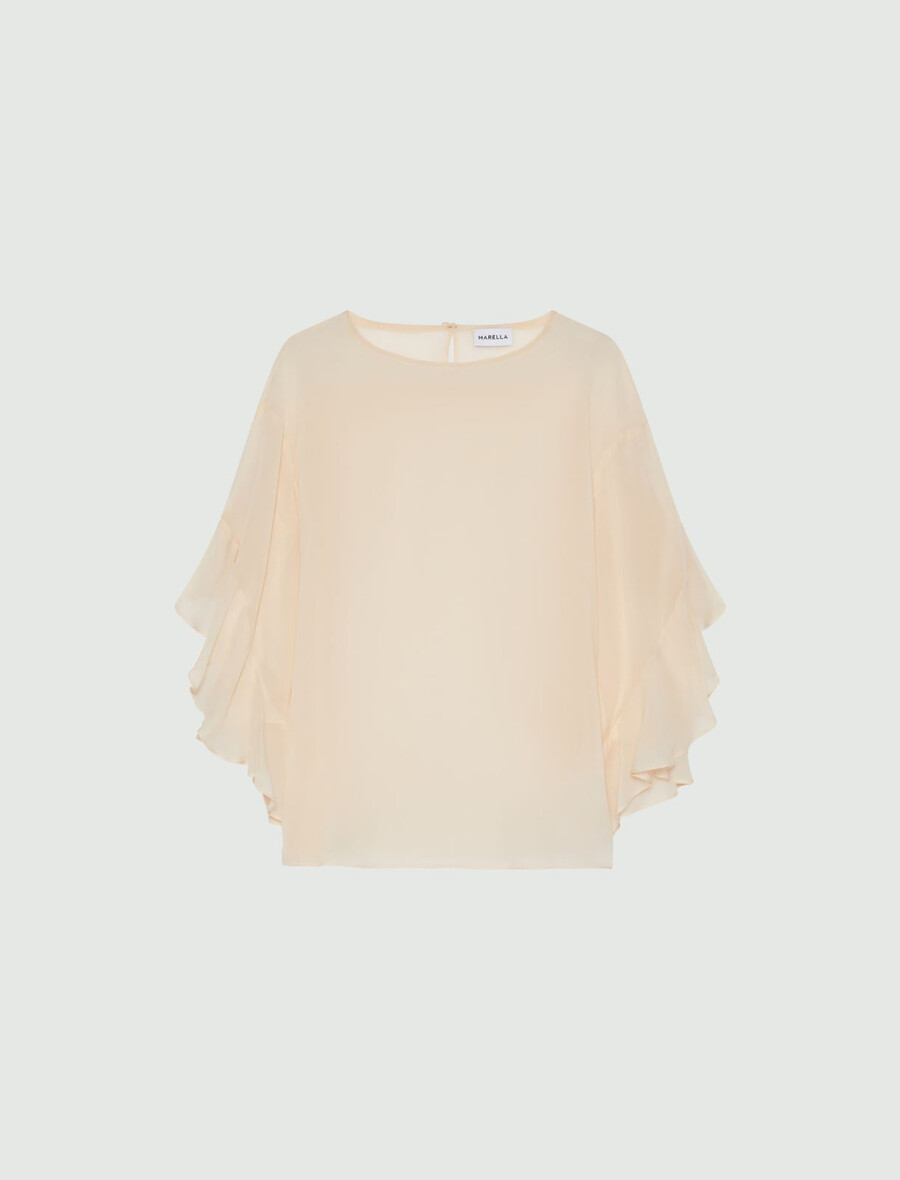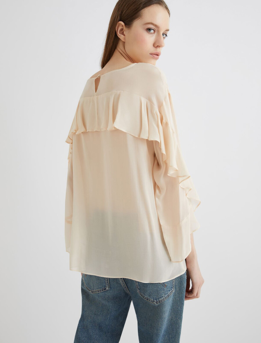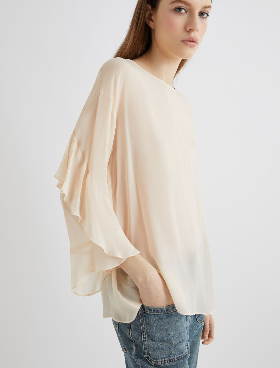 Un capo essenziale con un tocco di originalità: questa nuova blusa vanta uno scollo arrotondato e un corpetto leggermente svasato. Il volant sul polsino si estende lungo la manica e abbraccia la schiena, conferendo movimento e un tocco femminile all’intero modello.