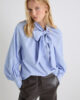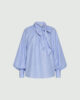 Un classico rivisitato: la nuova blusa in popeline con motivo a righe lurex lucido. La giusta dose di luminosità e tocchi romantici, come la fascia al collo e le maniche arricciate.