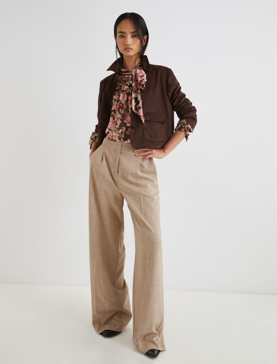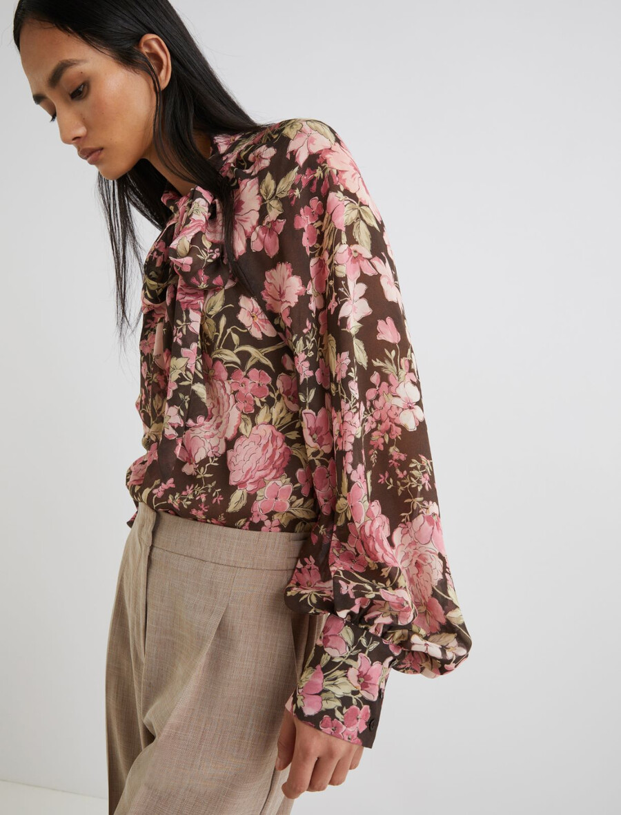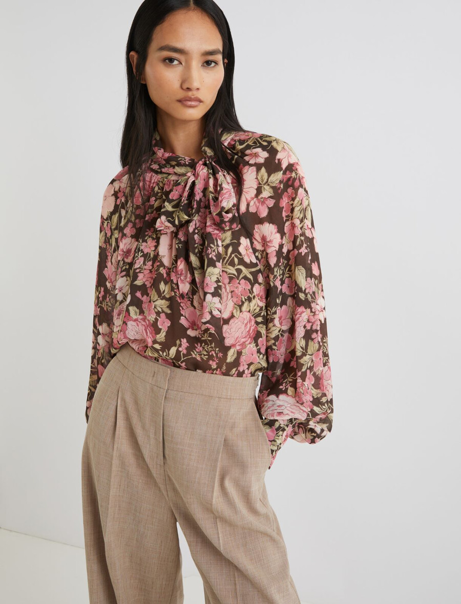 Questa blusa in georgette dalla vestibilità comoda, completa di foulard da annodare al collo, è decorata con un vivace motivo floreale. Abbinala a giacche corte in tinta e pantaloni fluidi per un look casual ma ultra-femminile.