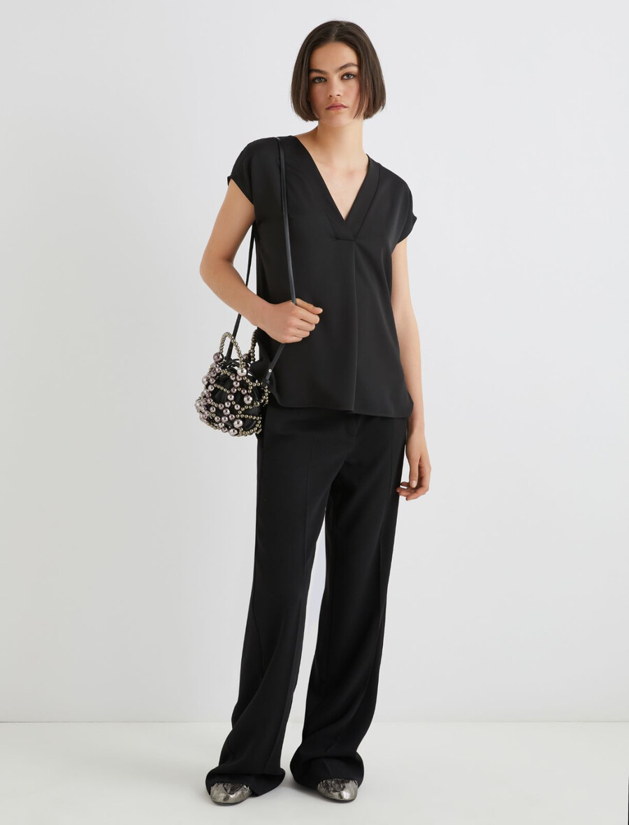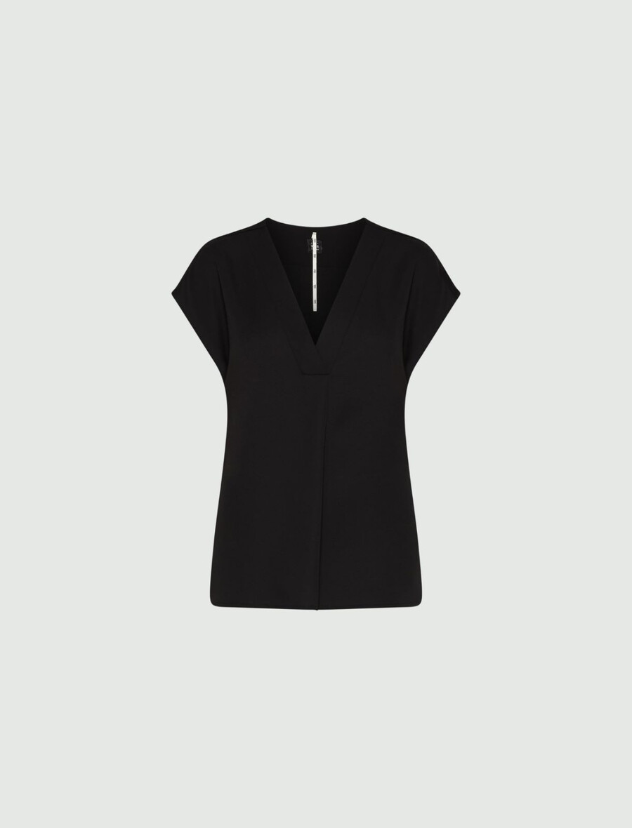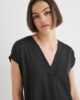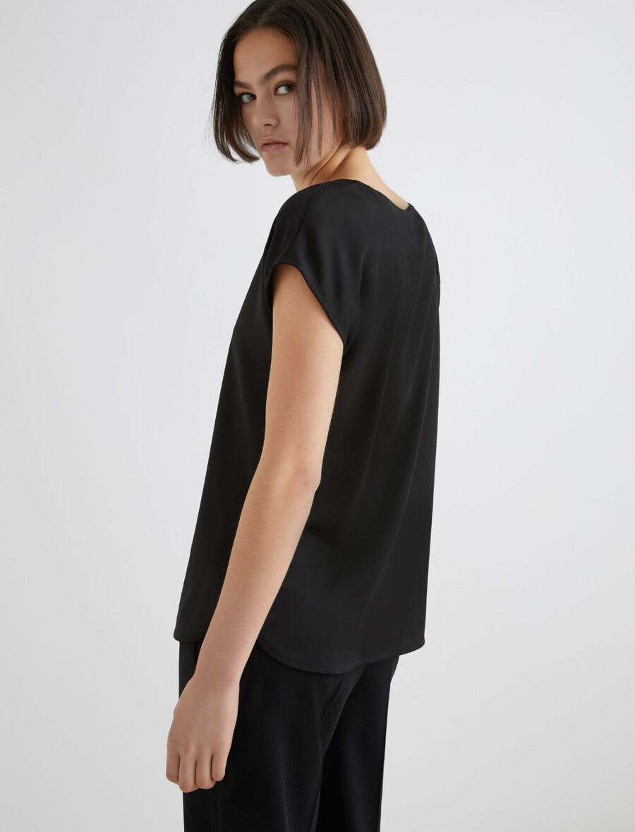 Minimalista con un tocco di originalità: questa blusa in raso accarezza la pelle e riflette la luce grazie alla sua delicata lucentezza. Presenta maniche a kimono e scollo a V per una sorprendente versatilità.