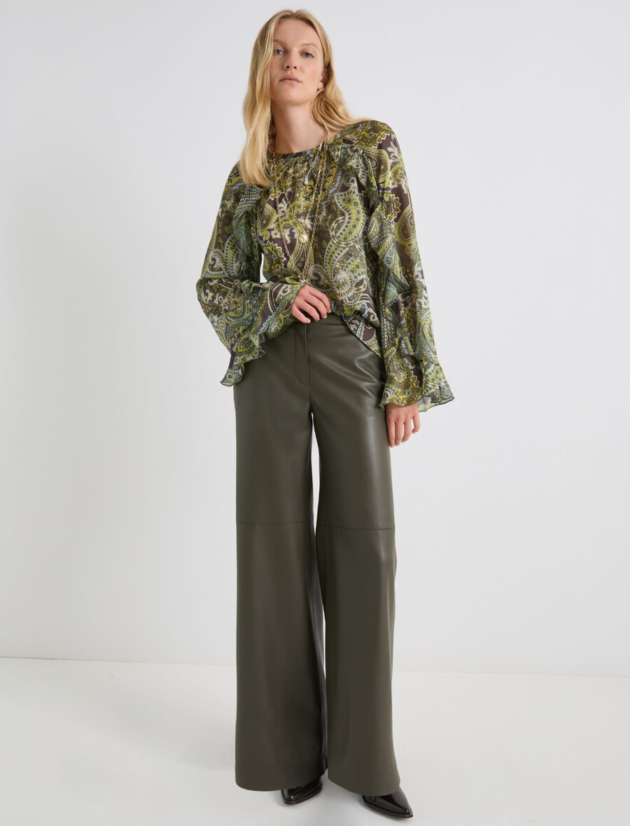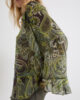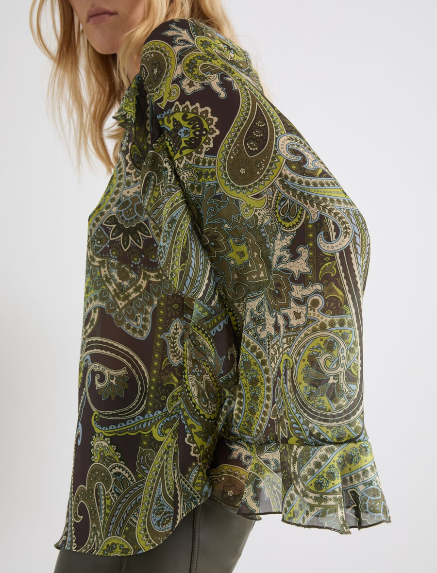 Un’elegante stampa paisley e romantici volant: questa nuova camicia è un’affermazione di stile con le sue tonalità intense e il tessuto leggero in chiffon.