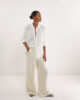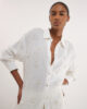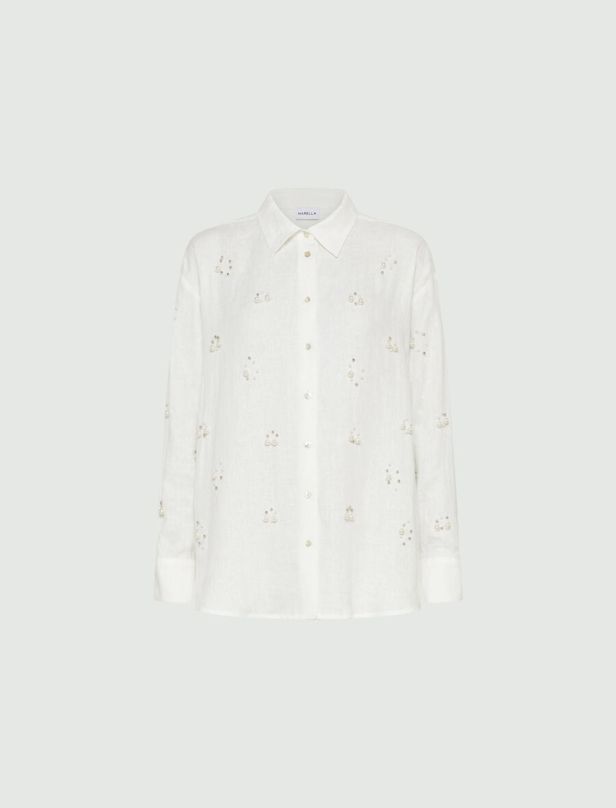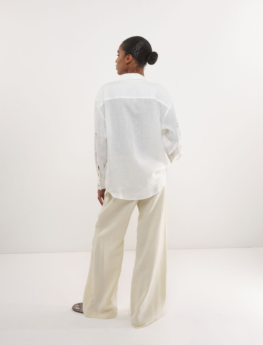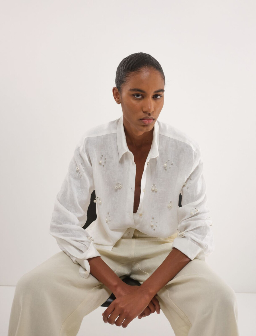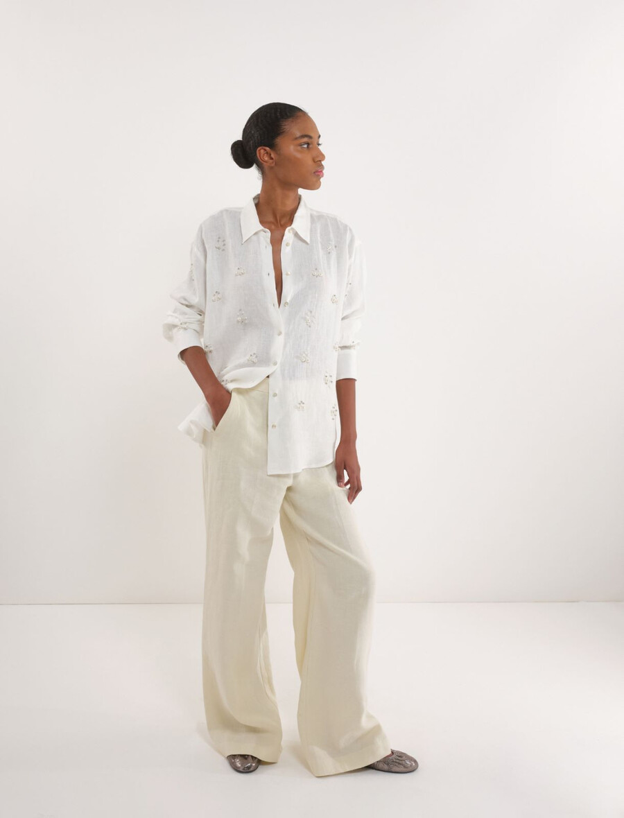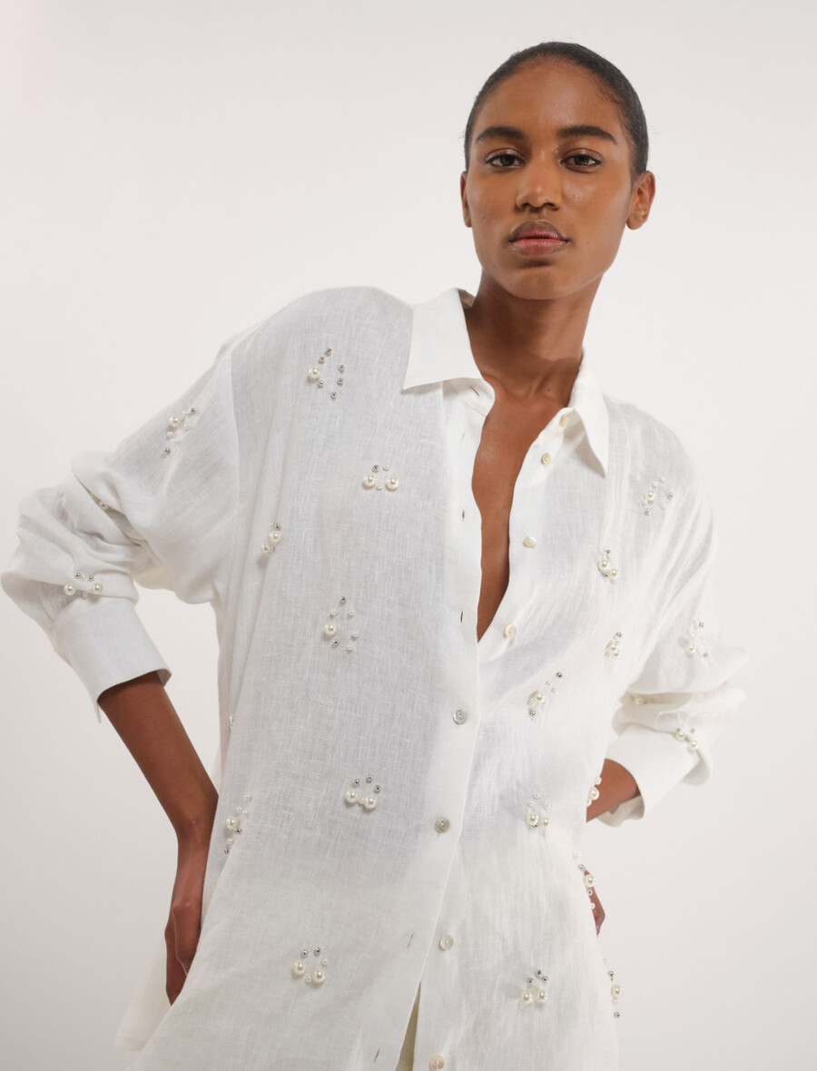 Una rivisitazione cool della camicia di lino con vestibilità comoda, spalle scese e ricami scintillanti, perle e borchie. Aggiungi bigiotteria e pantaloni fluidi per un perfetto look da città.