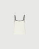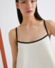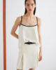 Top canotta in envers satin leggero con dettagli a contrasto per un tocco sportivo. Abbinalo alla gonna plissettata coordinata e al bomber in crêpe per un look cittadino all’insegna della leggerezza.