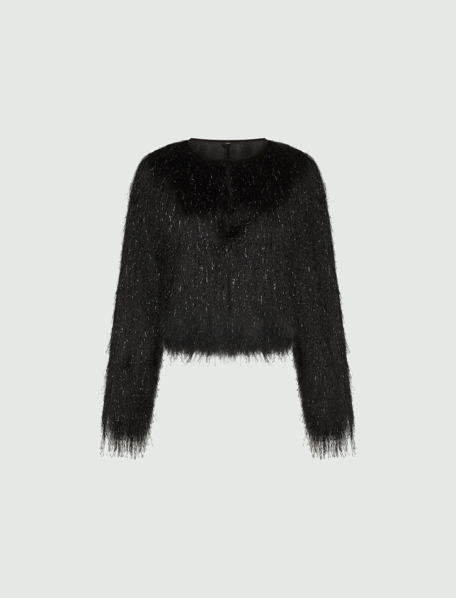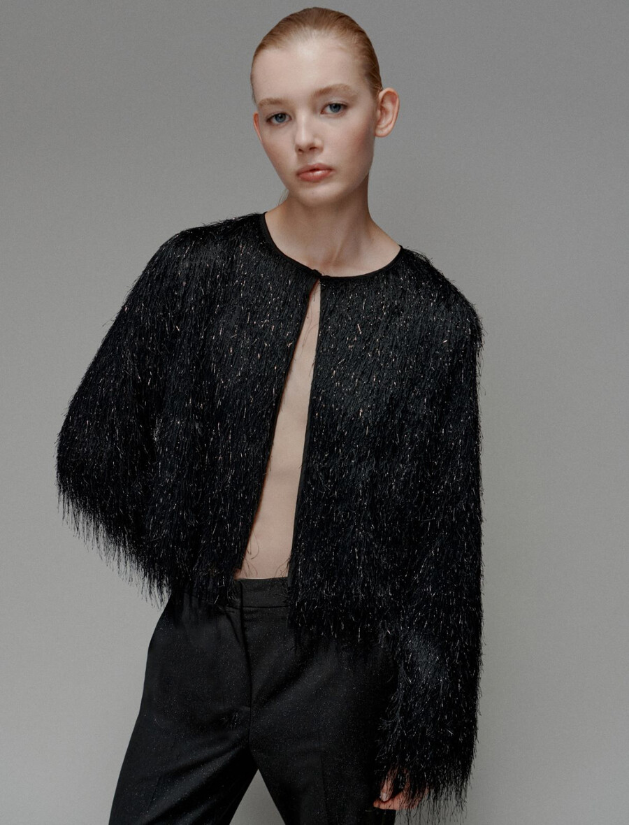 Il caratteristico motivo a frange conferisce un’allure festosa a questo cardigan in jersey. Abbinalo a un top senza maniche e pantaloni svasati per un look da festa sorprendente.