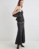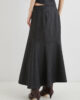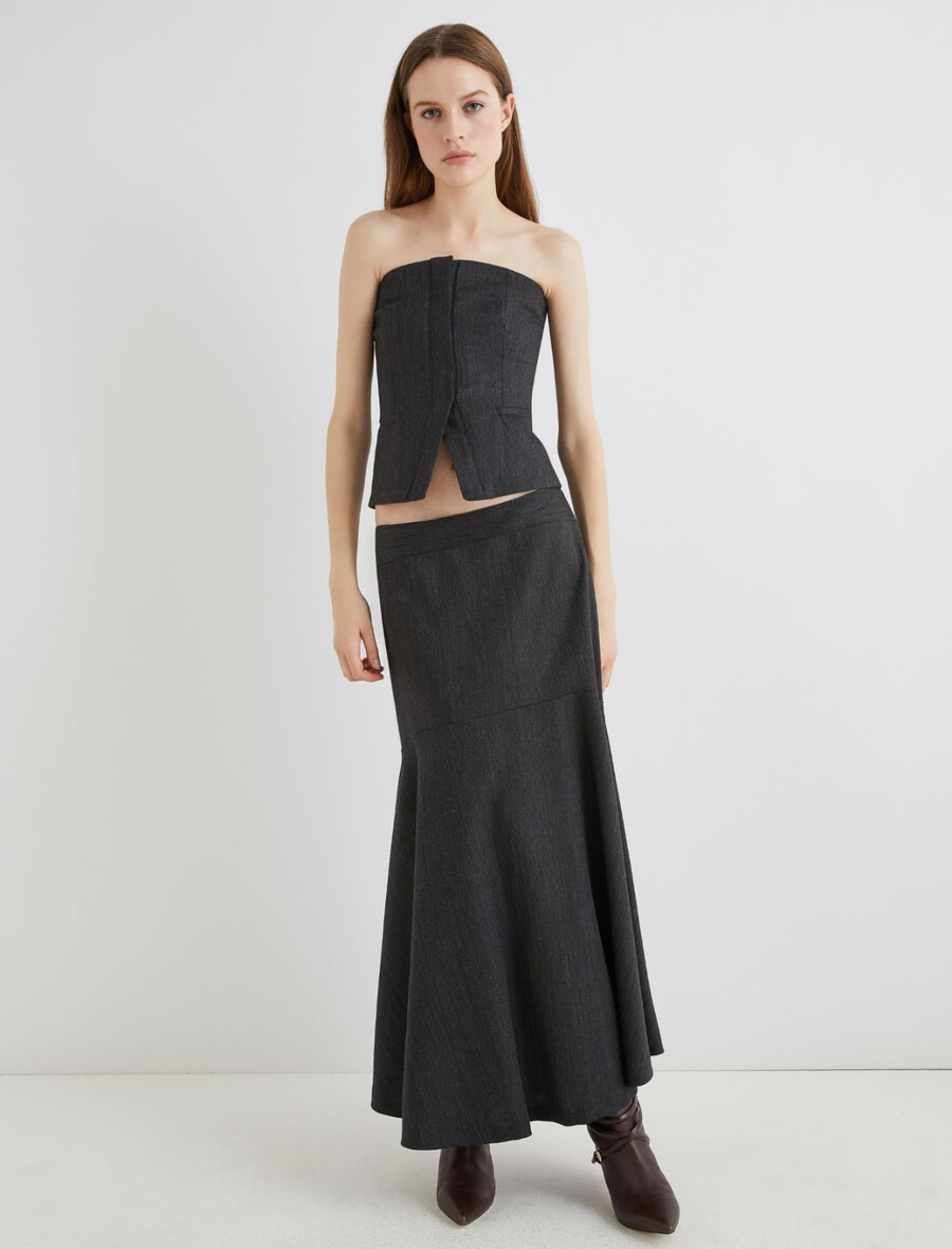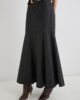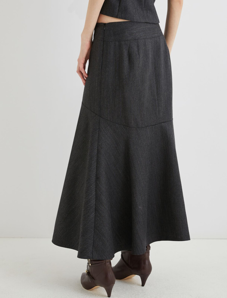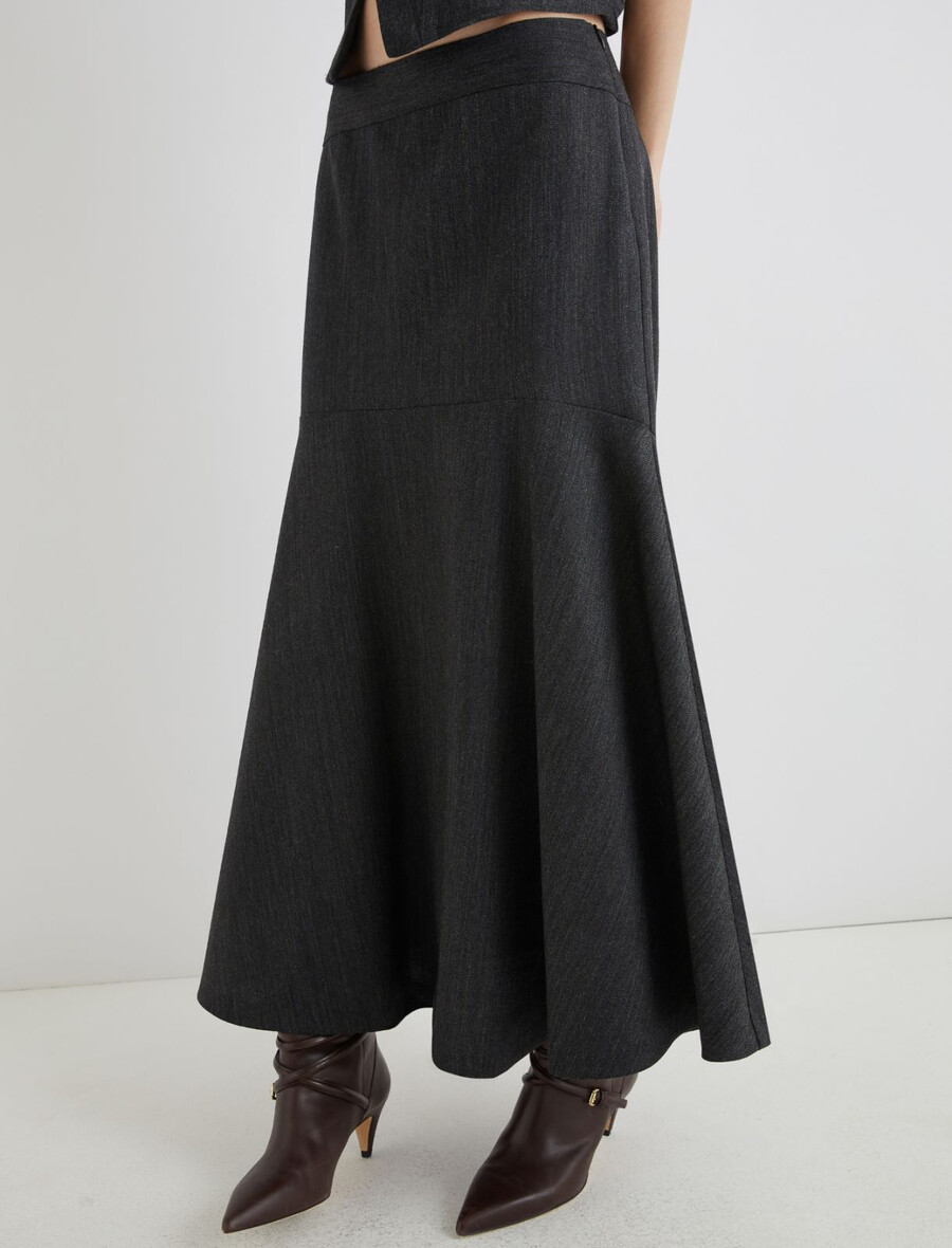 Questa nuova gonna in lana sorprende per il suo taglio a campana e il design con pinces sagomate. Perfetta con stivali, un maglione largo e bigiotteria che mette in risalto la figura.