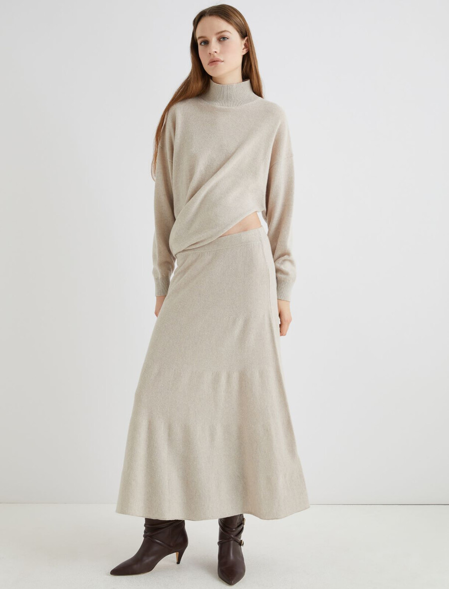 Questa calda e avvolgente gonna al polpaccio in misto cashmere ti avvolgerà perfettamente in questa stagione fredda. Presenta un elastico in vita per il massimo comfort e può essere indossata con un maglione e degli stivali per un perfetto look da città.