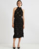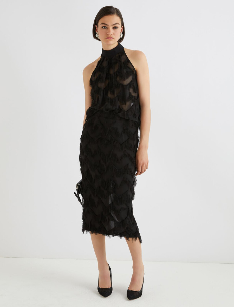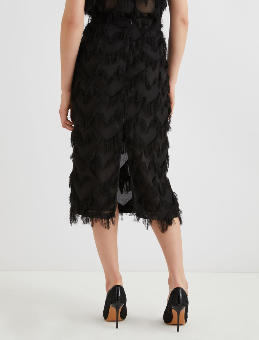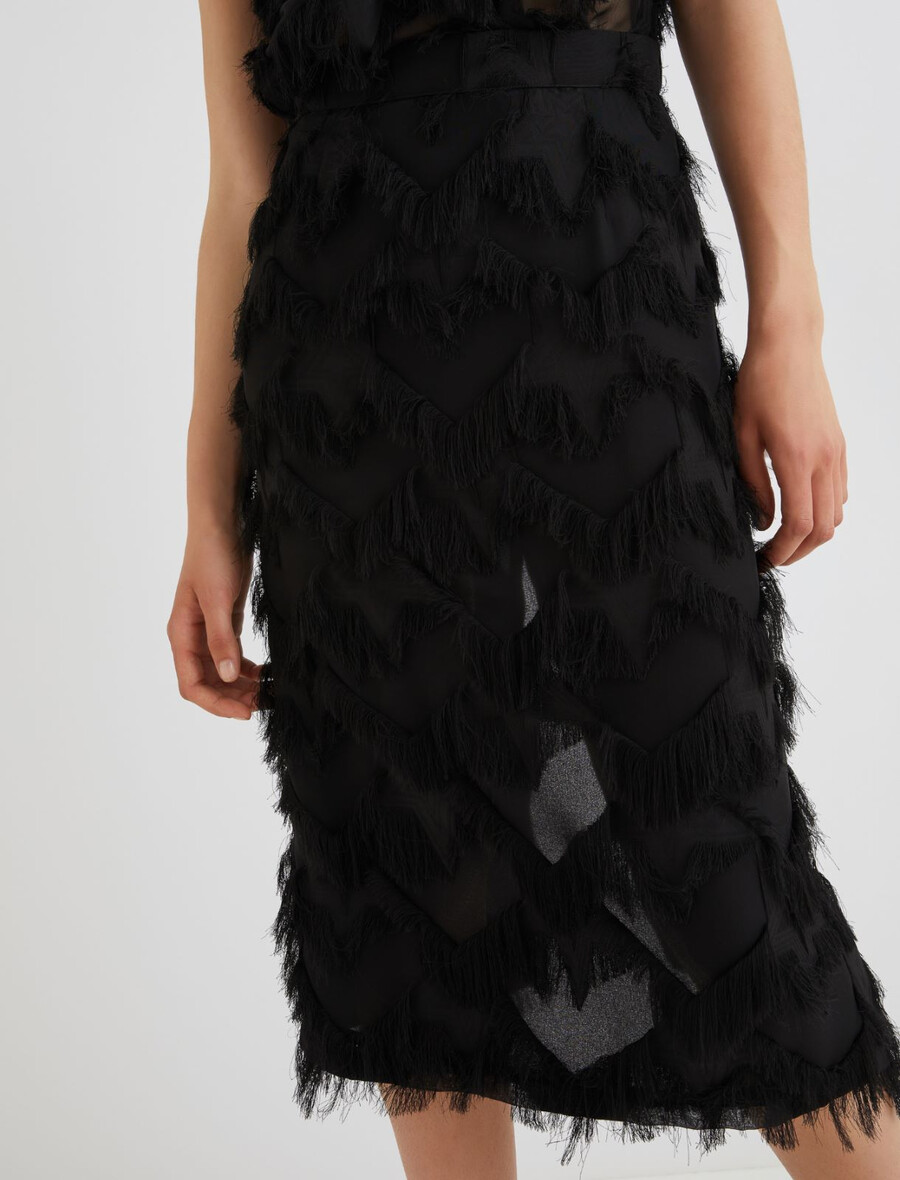 Pensata per le occasioni più eleganti: questa gonna in georgette è decorata con una frangia fil coupé a fantasia. Indossa questo modello sensuale e femminile con il top coordinato per le tue serate glamour.