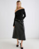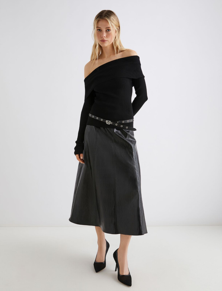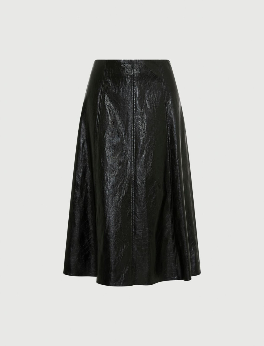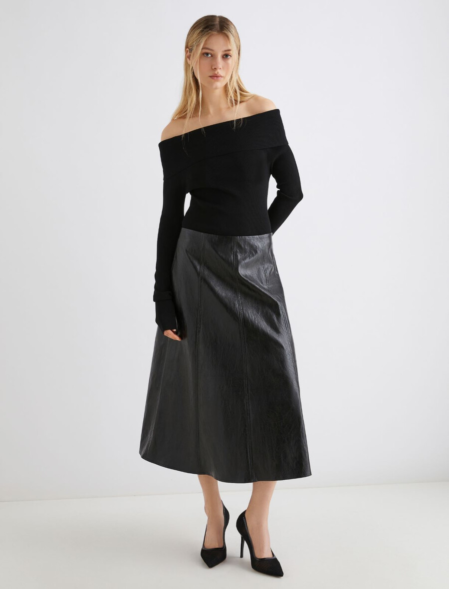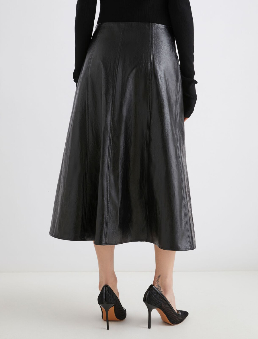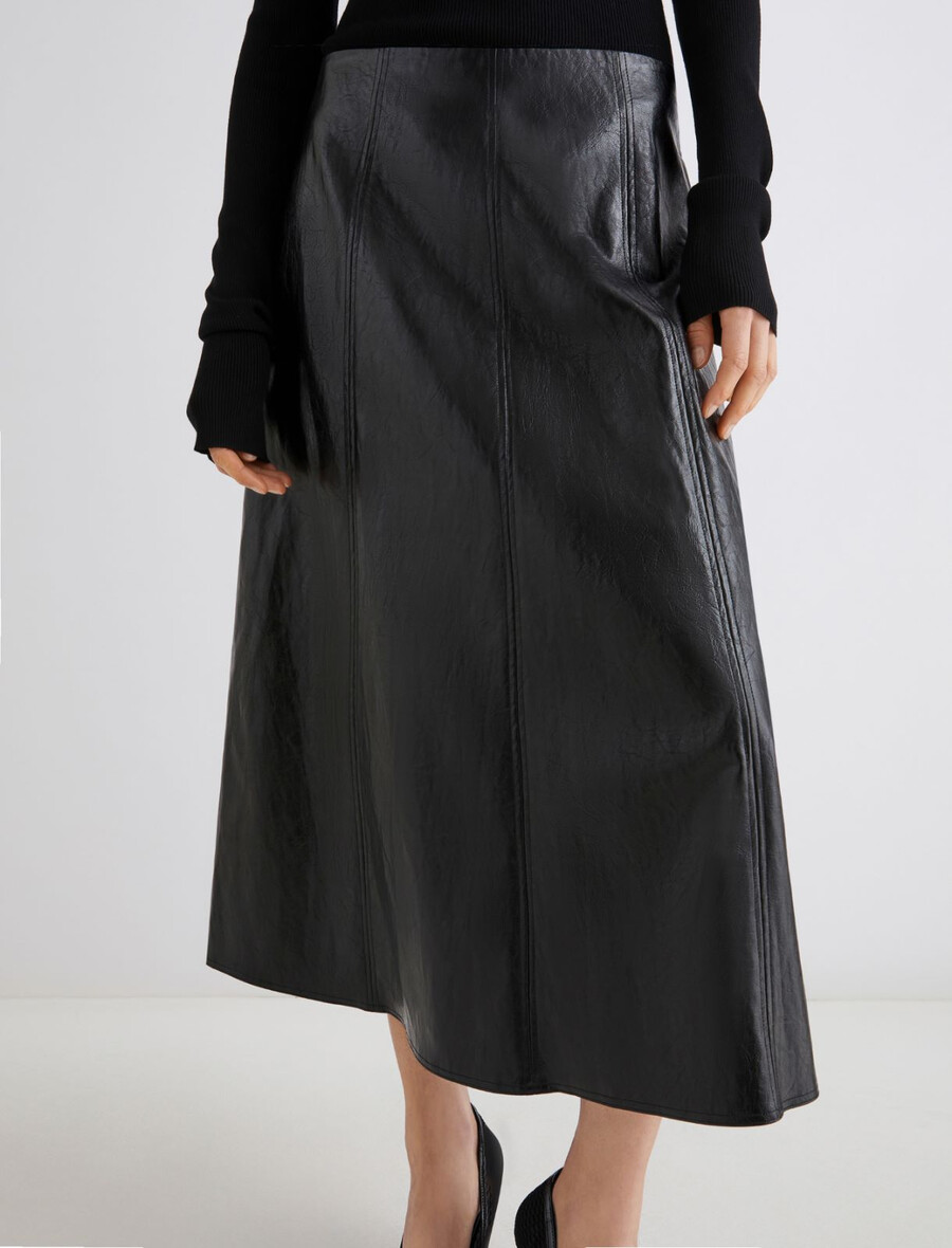 Taglio svasato e pannelli decorati da impunture a vista: questa nuova gonna unisce una vestibilità classica e femminile a un tessuto in twill spalmato dal sapore urbano. Provala con il trench coordinato per un sorprendente mix di colori e materiali.