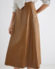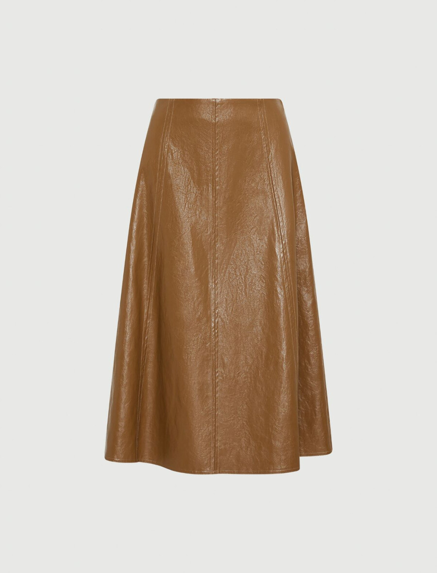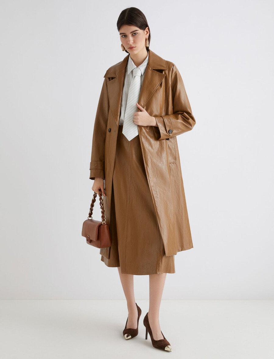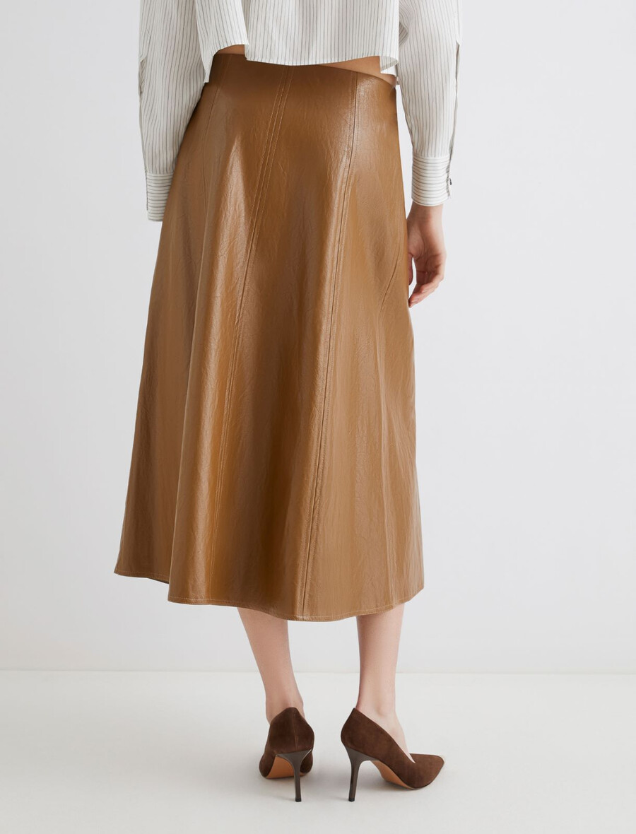 Taglio svasato e pannelli decorati da impunture a vista: questa nuova gonna unisce una vestibilità classica e femminile a un tessuto in twill spalmato dal sapore urbano. Provala con il trench coordinato per un sorprendente mix di colori e materiali.