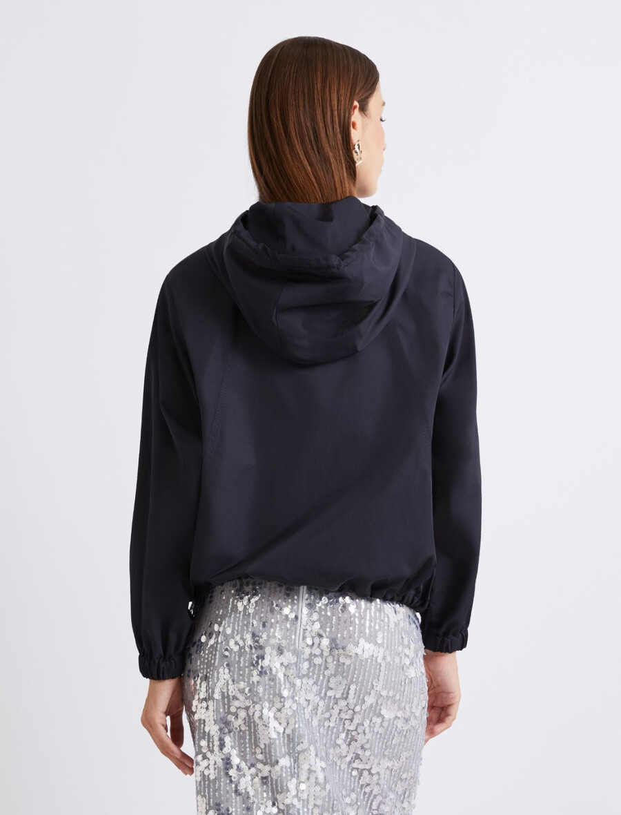 • Scollo rotondo impreziosito da cappuccio con coulisse.