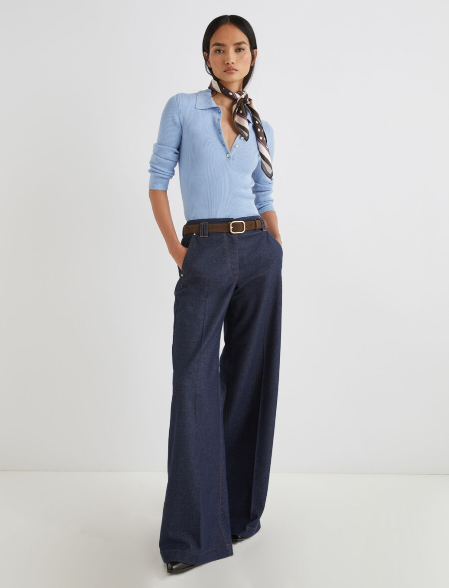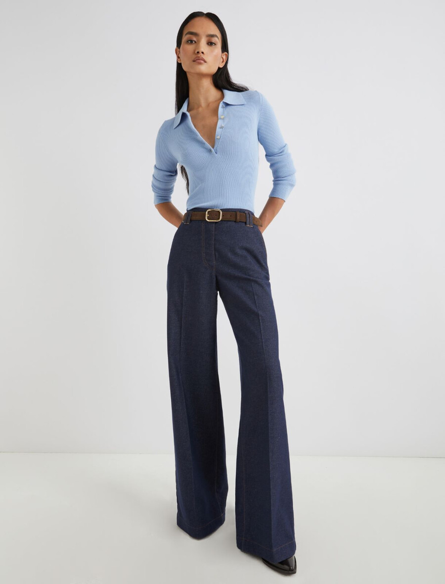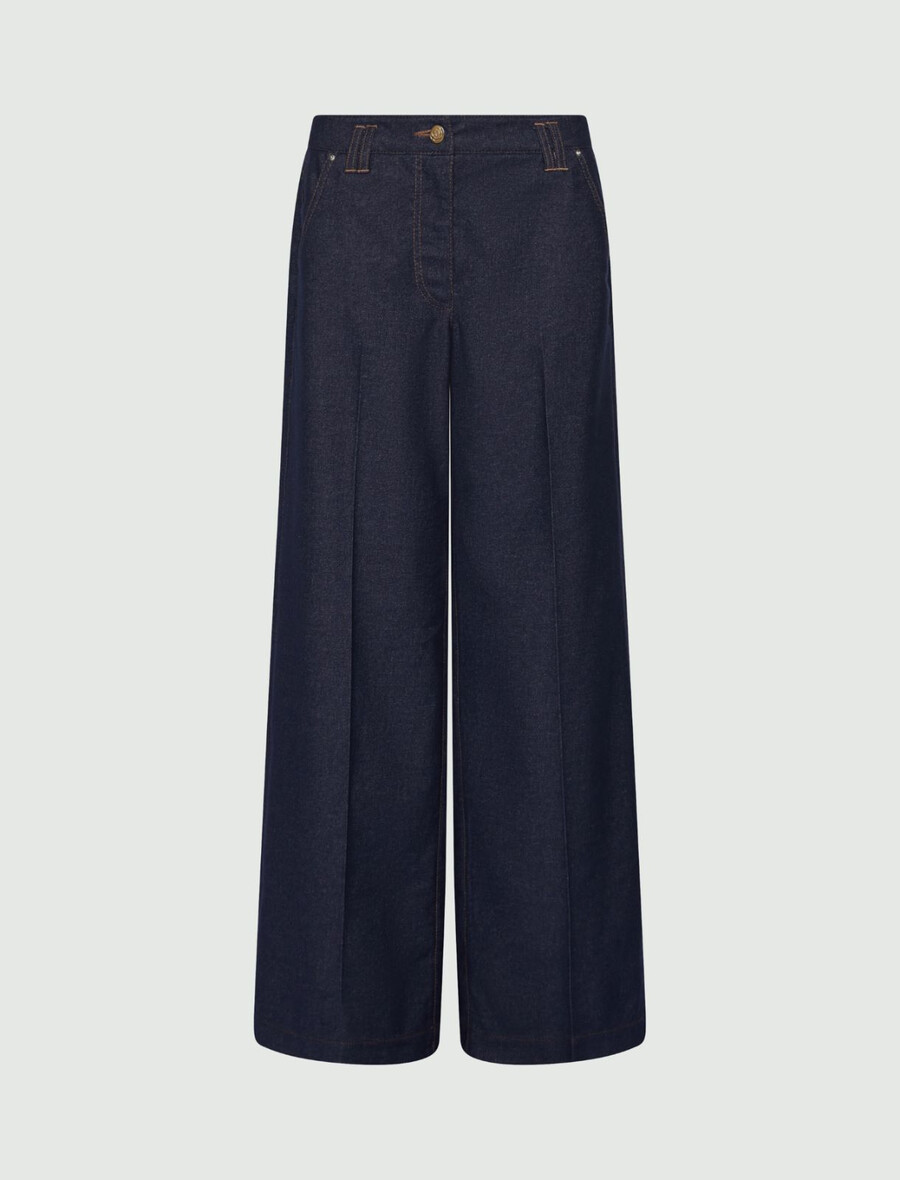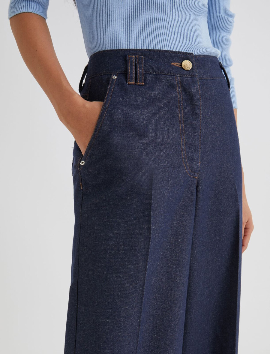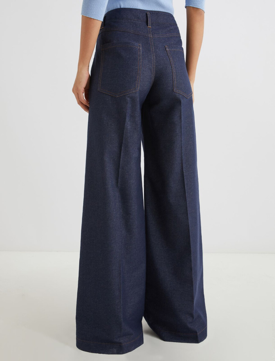 Elegante e casual: una nuova versione in cotone elasticizzato del modello di pantaloni a gamba larga, con tasche applicate sul retro per un tocco più rilassato. I rivetti aggiungono un tocco jeans sobrio alle tasche sartoriali.