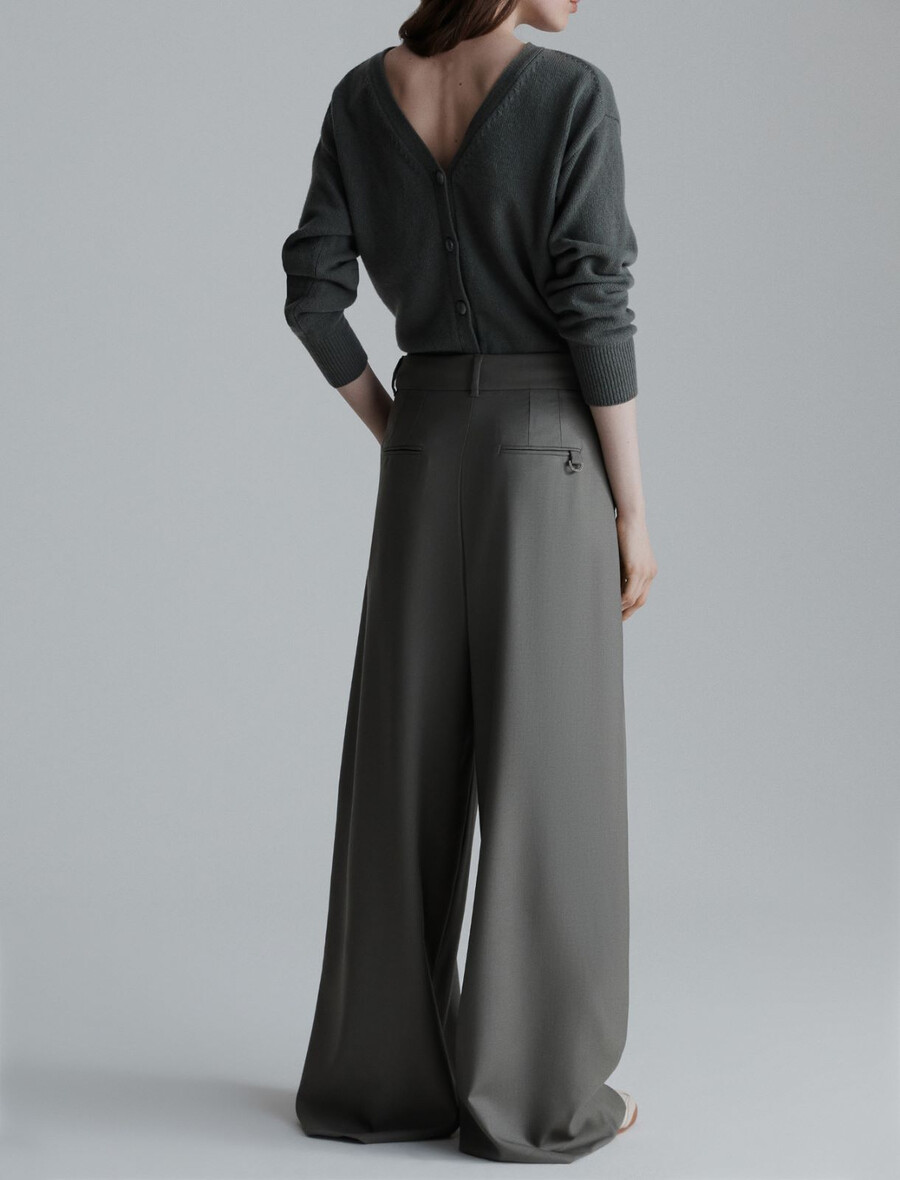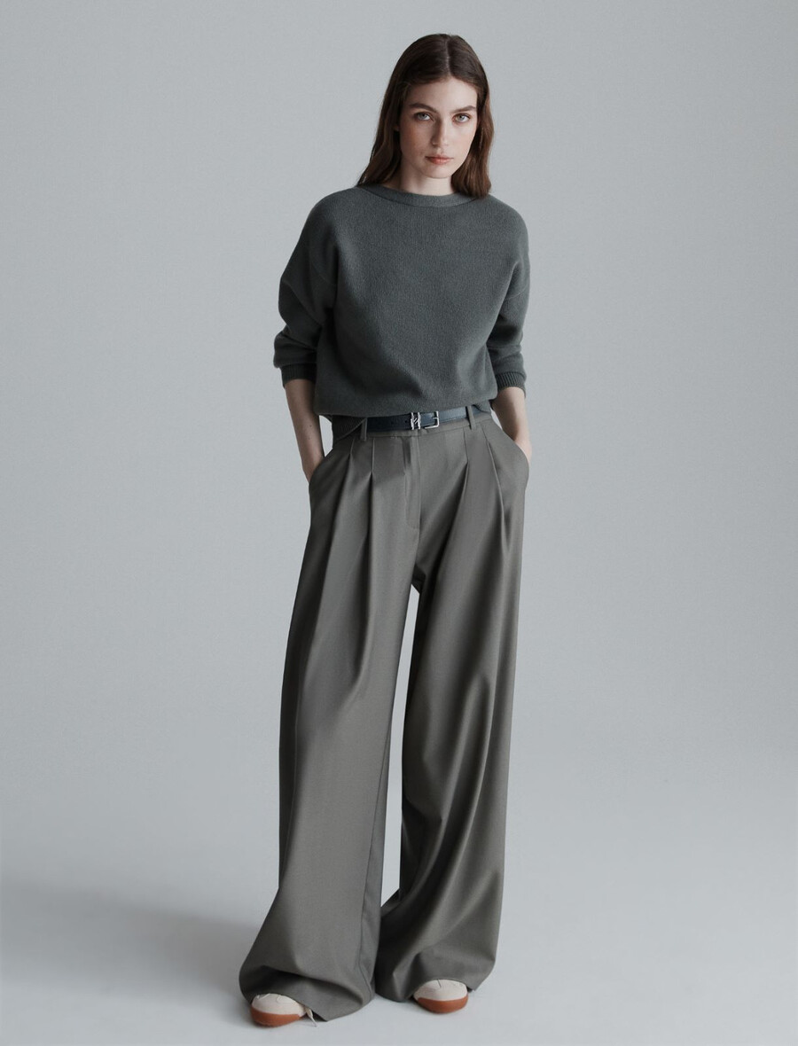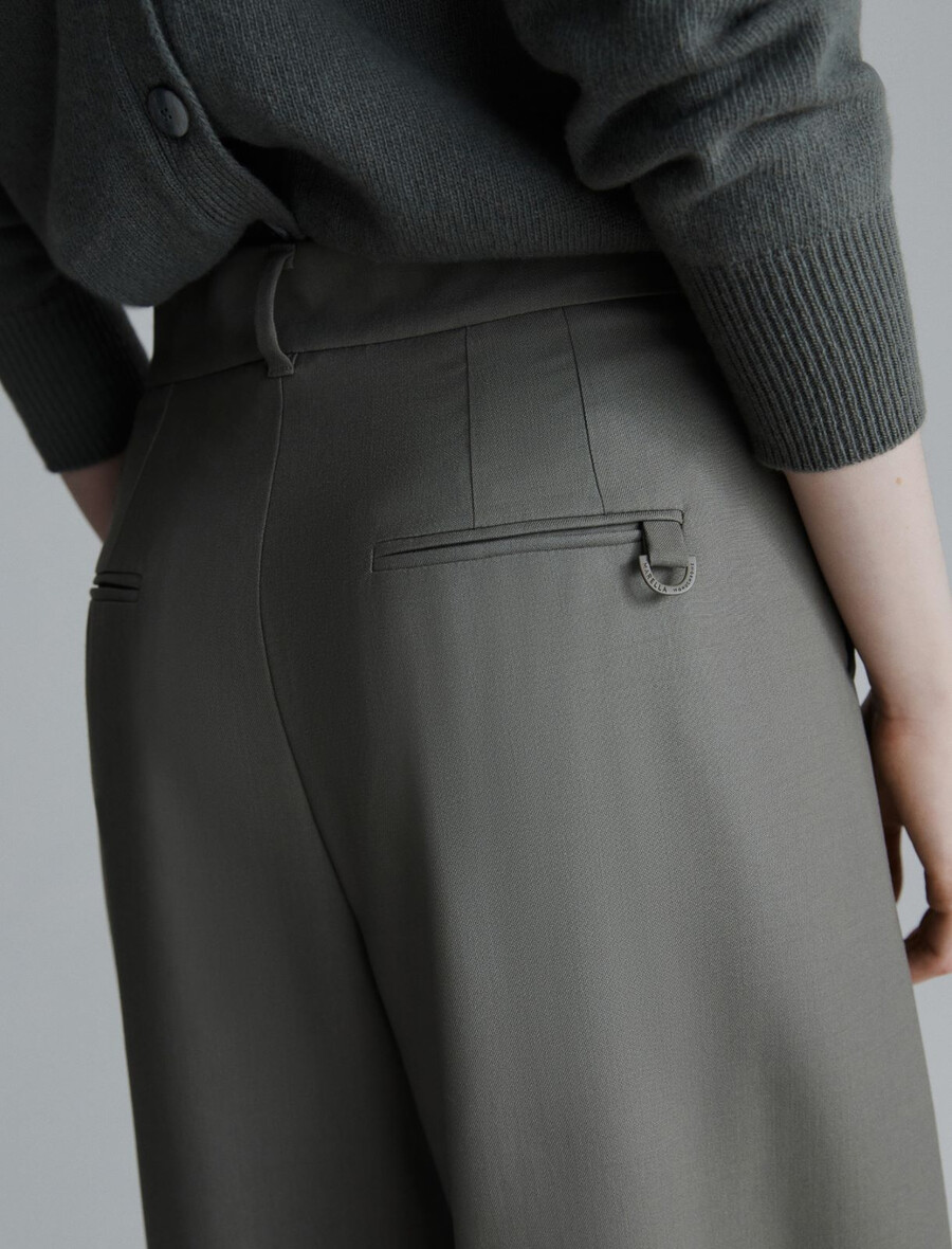 Eleganza urbana con un tocco di raffinatezza: questi nuovi pantaloni a gamba larga in gabardine di pura lana vantano un dettaglio con doppia pince in vita e una vestibilità fluida. Indossali con un maglione boxy dai toni magmatici del grigio per un outfit urbano dall’anima glamour.