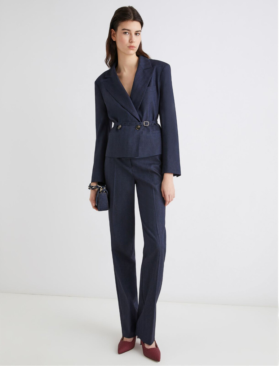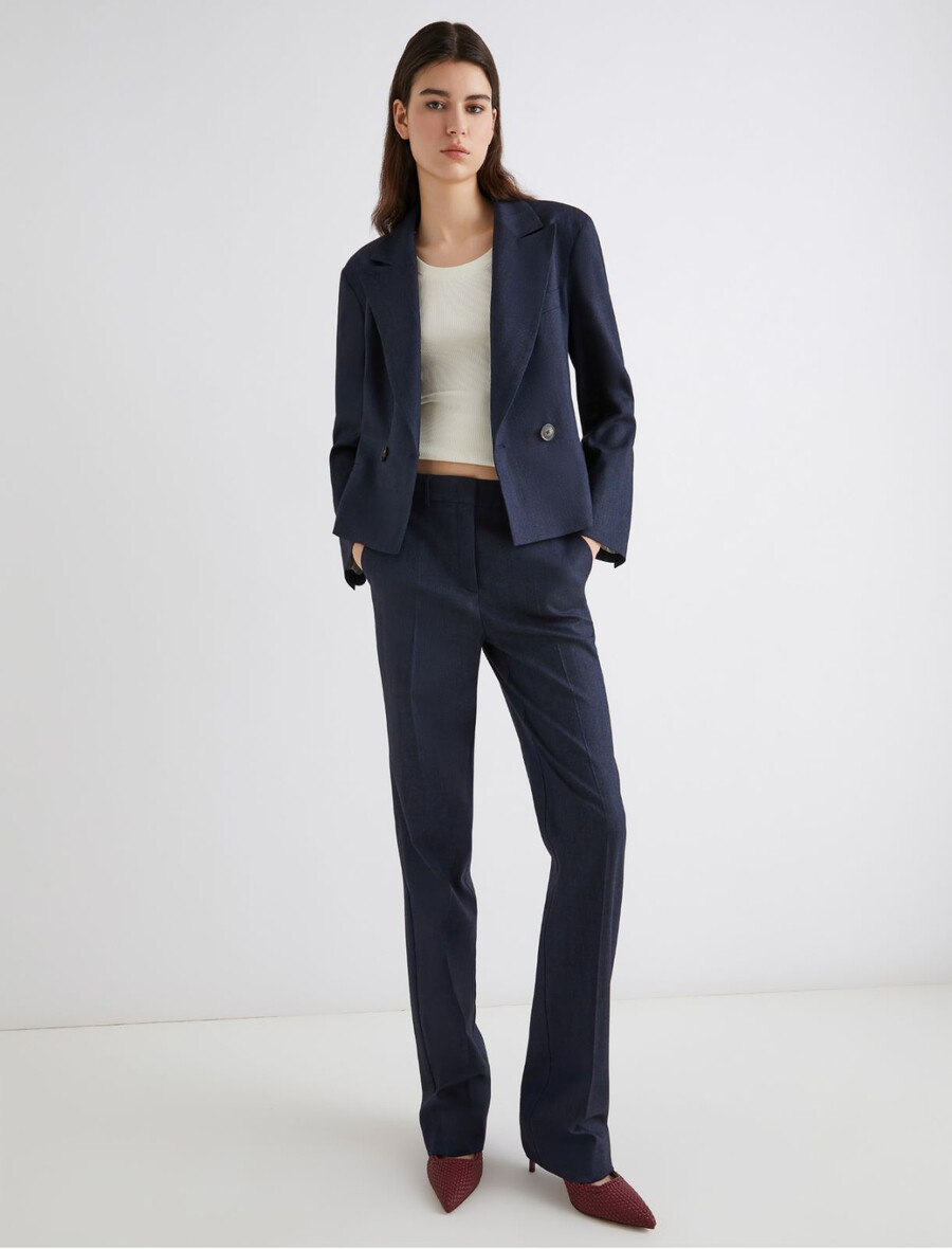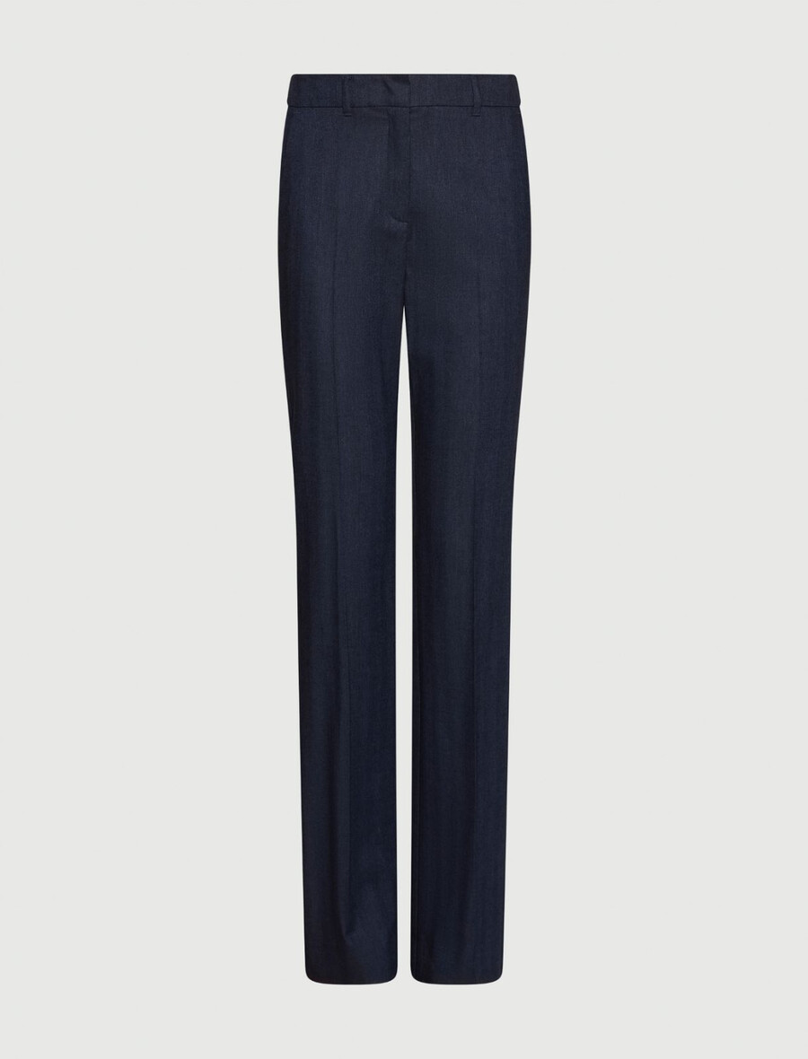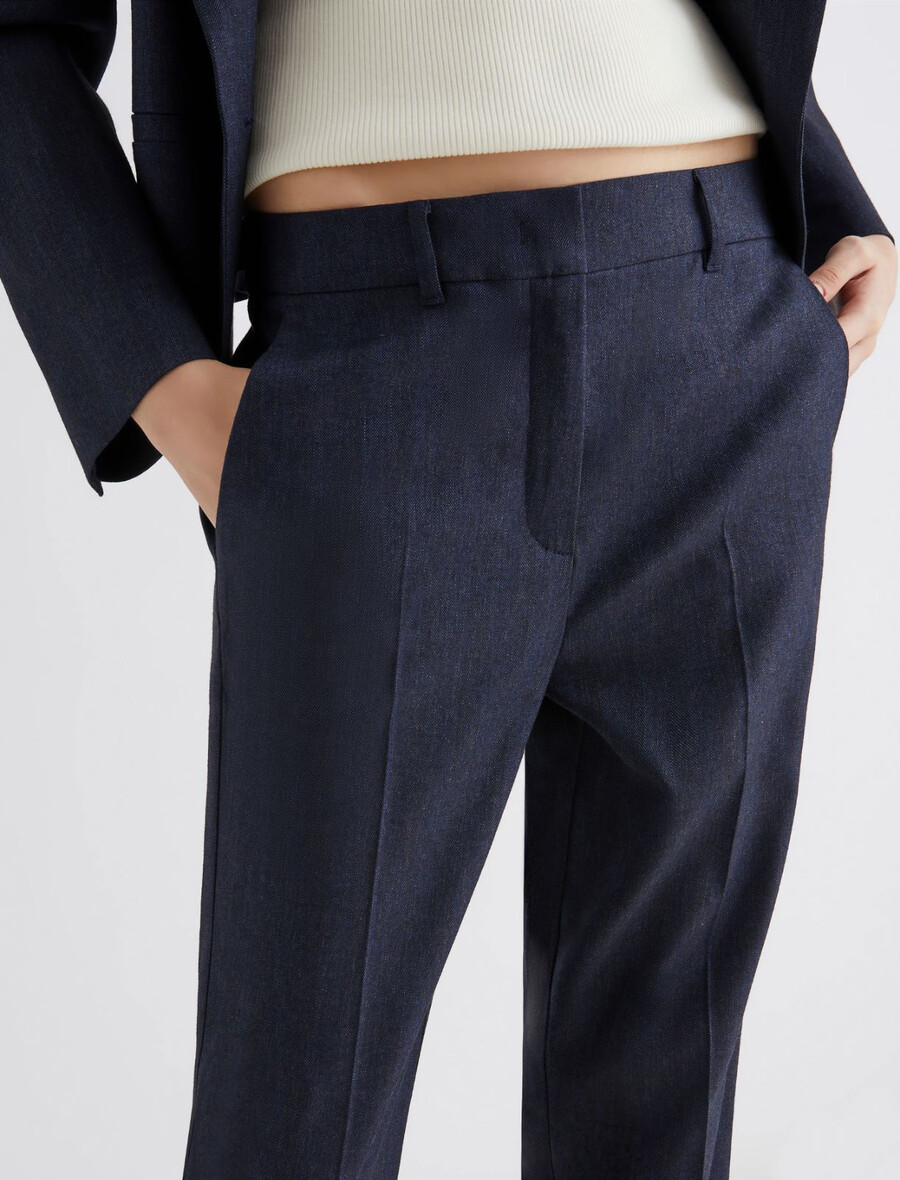 Se non resisti al fascino rivoluzionario del denim, allora adorerai questi pantaloni in misto viscosa effetto denim con vestibilità slim e un tocco di stretch per maggiore movimento. Il taglio sartoriale offre una versatilità infinita per look da ufficio o anche più casual.