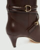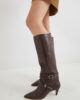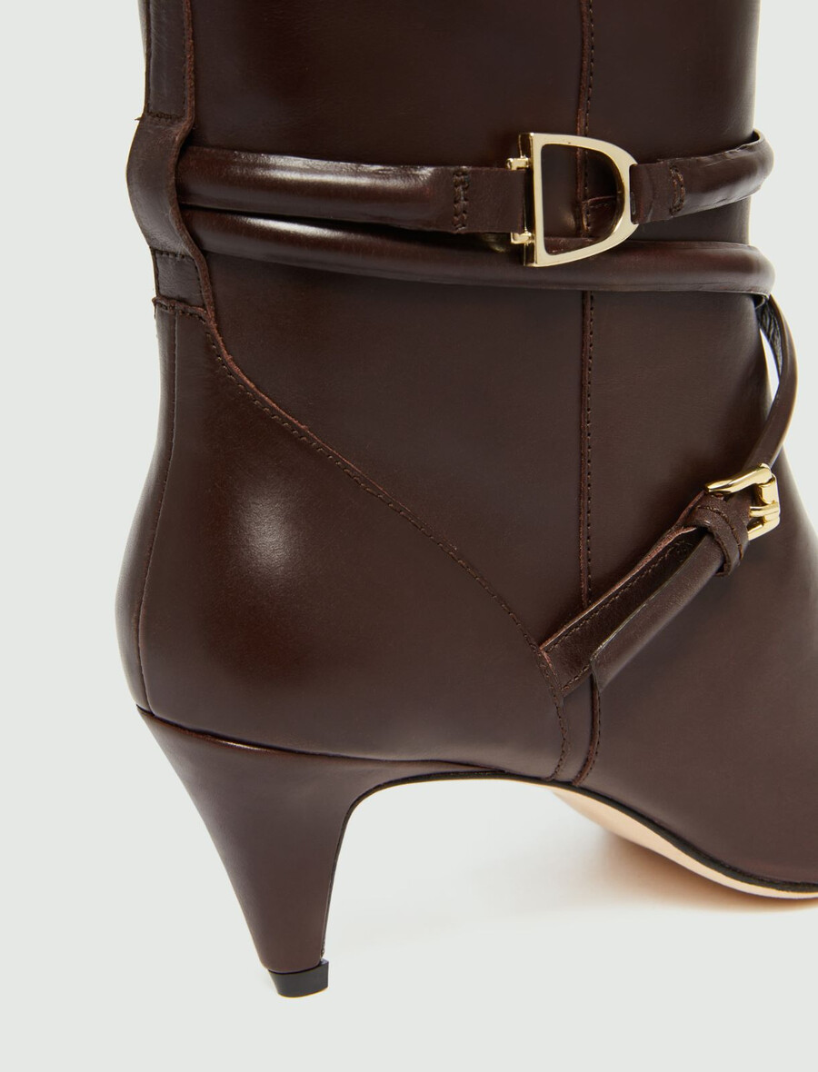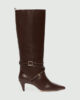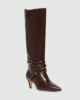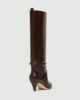 I nuovi stivali in pelle sotto il ginocchio sono decorati con cinturino intrecciato alla caviglia e fibbie in metallo lucido. Il tacco rivestito slancia la silhouette, offrendo al contempo comfort e stabilità con la sua altezza di 5,5 cm.