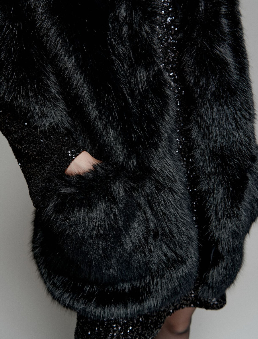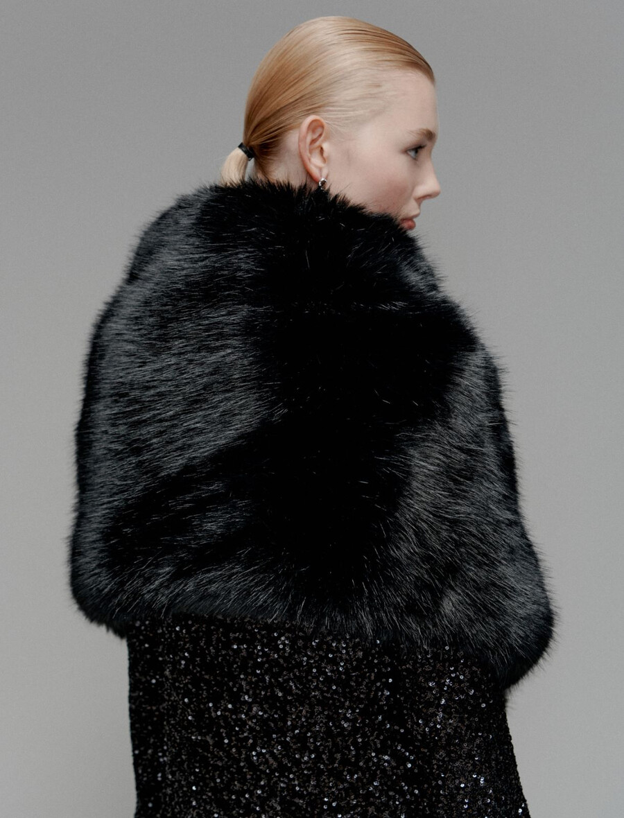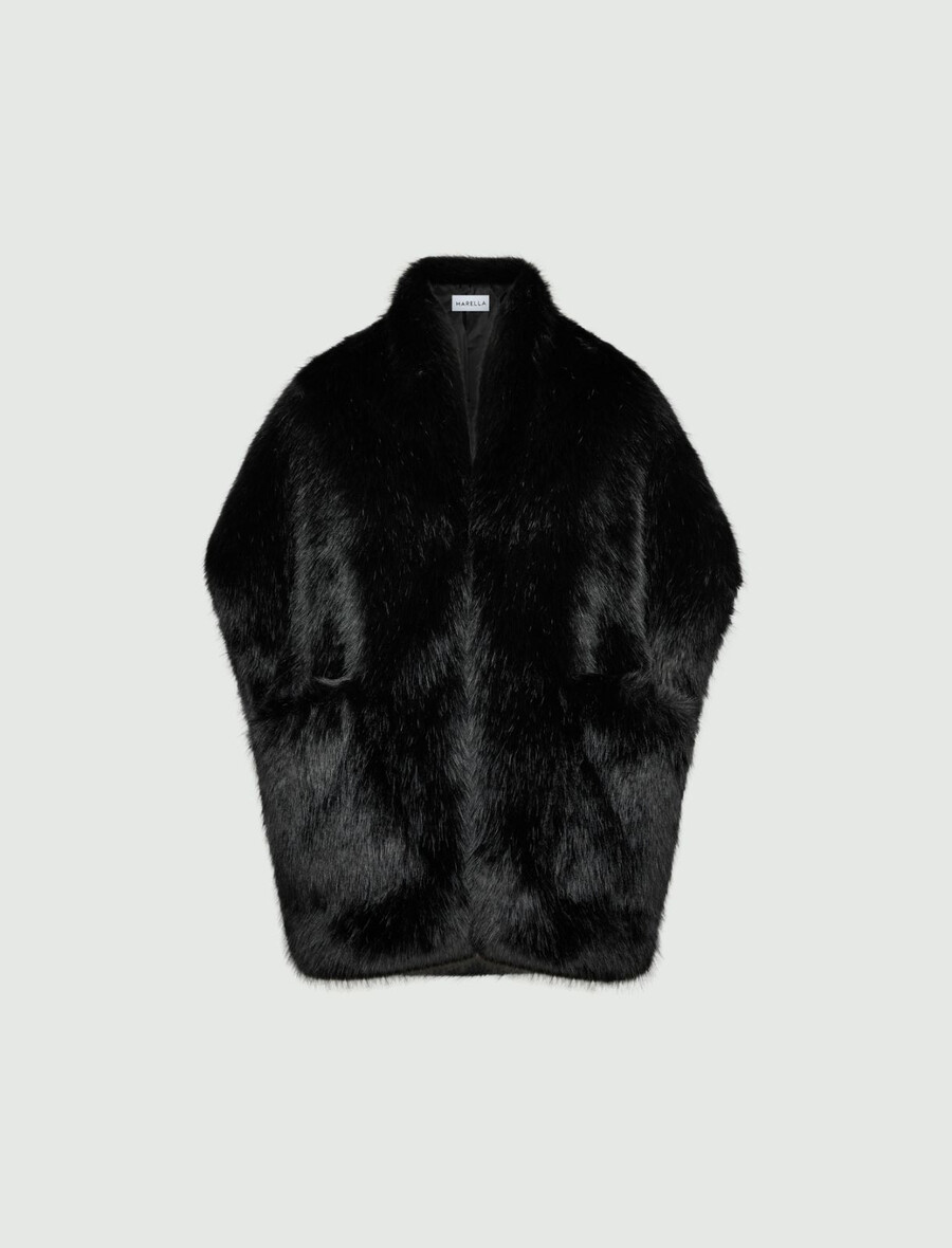 Non la solita stola. Prova questa nuova versione calda e avvolgente in tessuto effetto pelliccia, completa di tasche applicate sull’orlo per un tocco versatile ma giocoso.