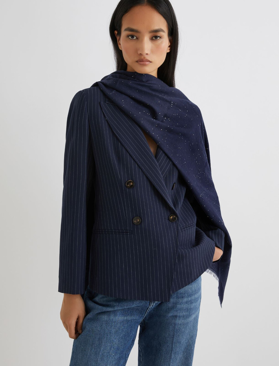 Immersa nelle stelle, sia per il giorno che per la sera: la nuova stola in lana con inserti in micro paillettes. Brilla al sole e può essere indossata con blazer e maglioni di tutti i giorni.