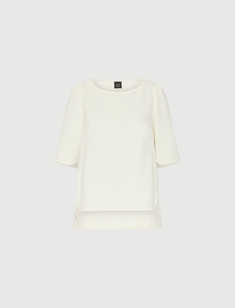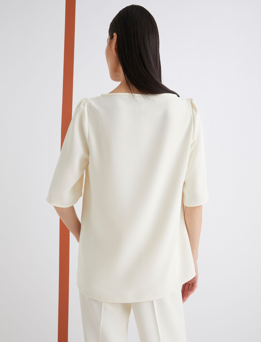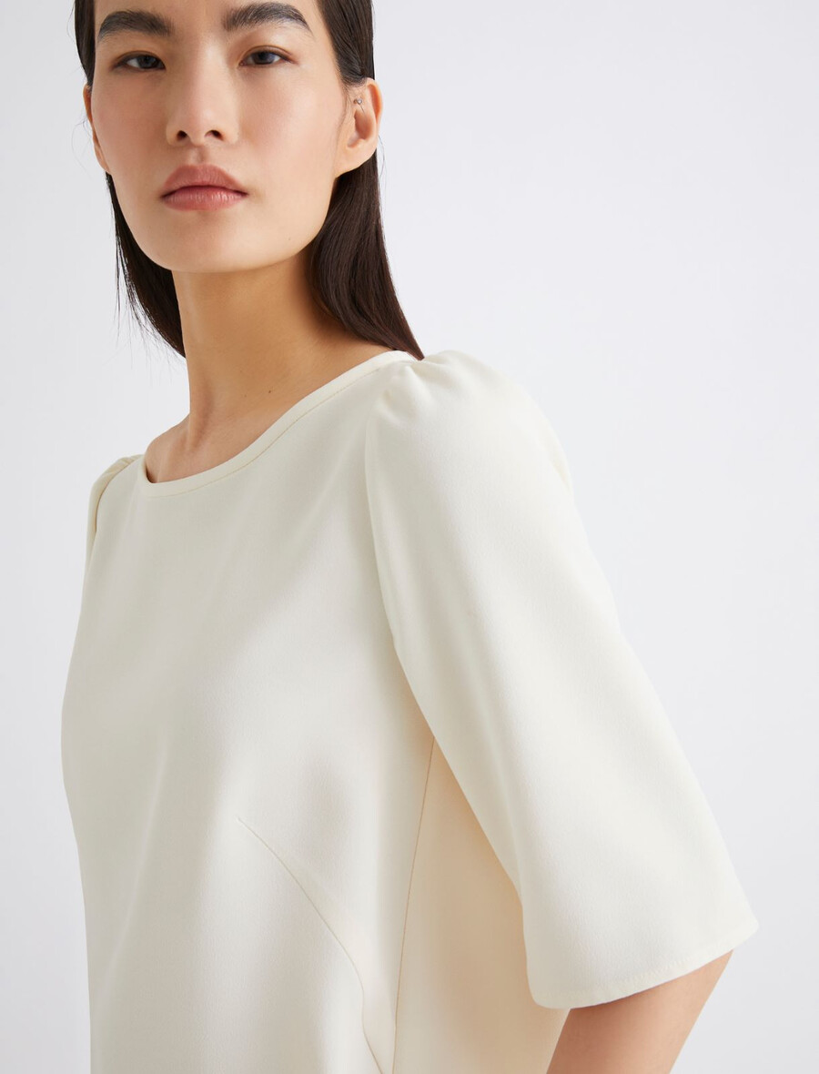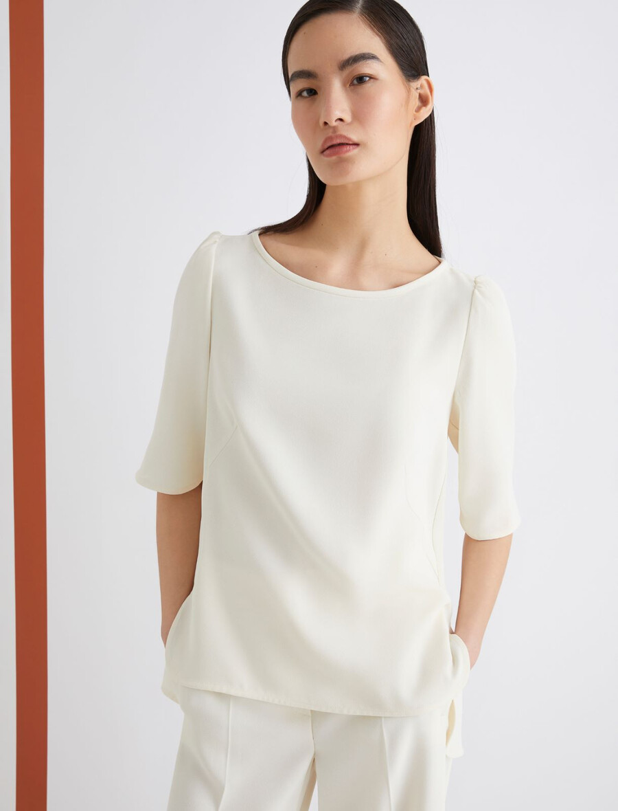 Una rivisitazione cool e metropolitana della T-shirt in envers satin: la scollatura arrotondata e le piccole arricciature sulle maniche aggiungono un tocco di femminilità al design essenziale.