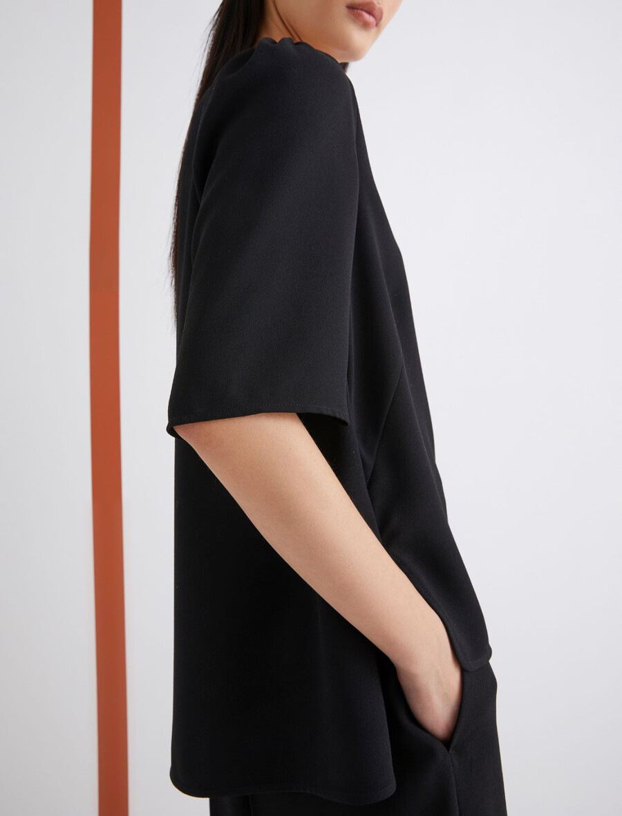 Una rivisitazione cool e metropolitana della T-shirt in envers satin: la scollatura arrotondata e le piccole arricciature sulle maniche aggiungono un tocco di femminilità al design essenziale.