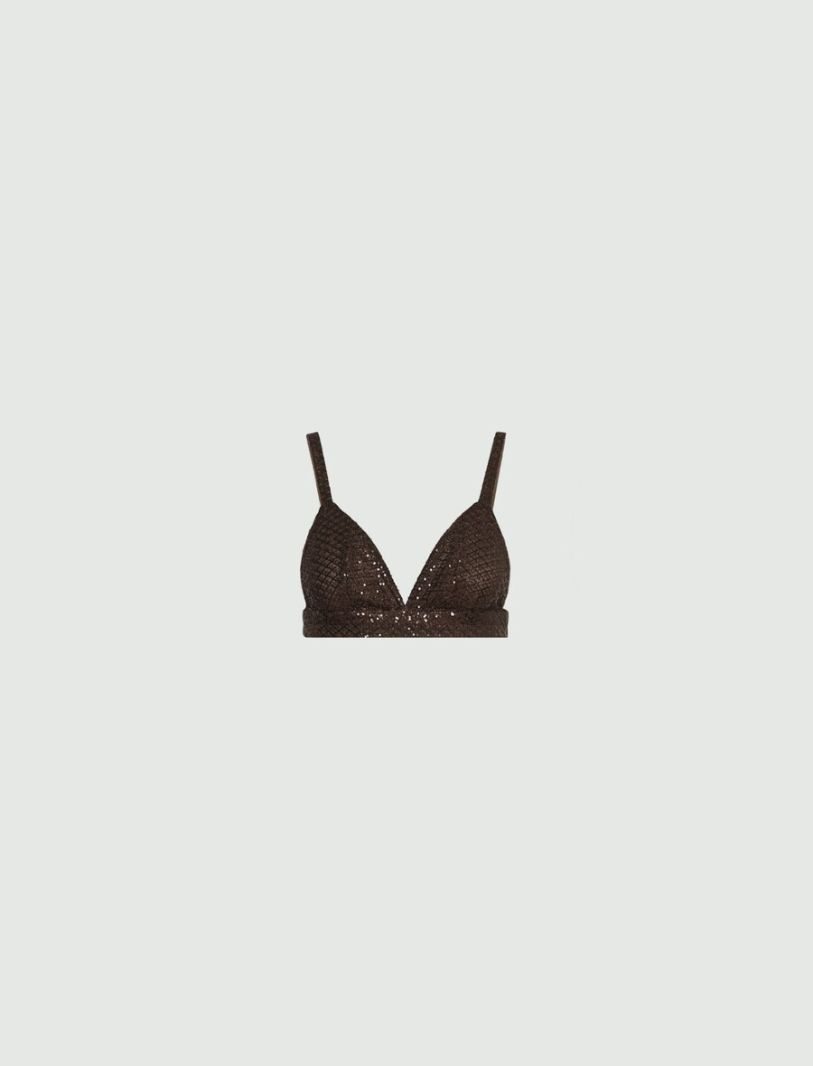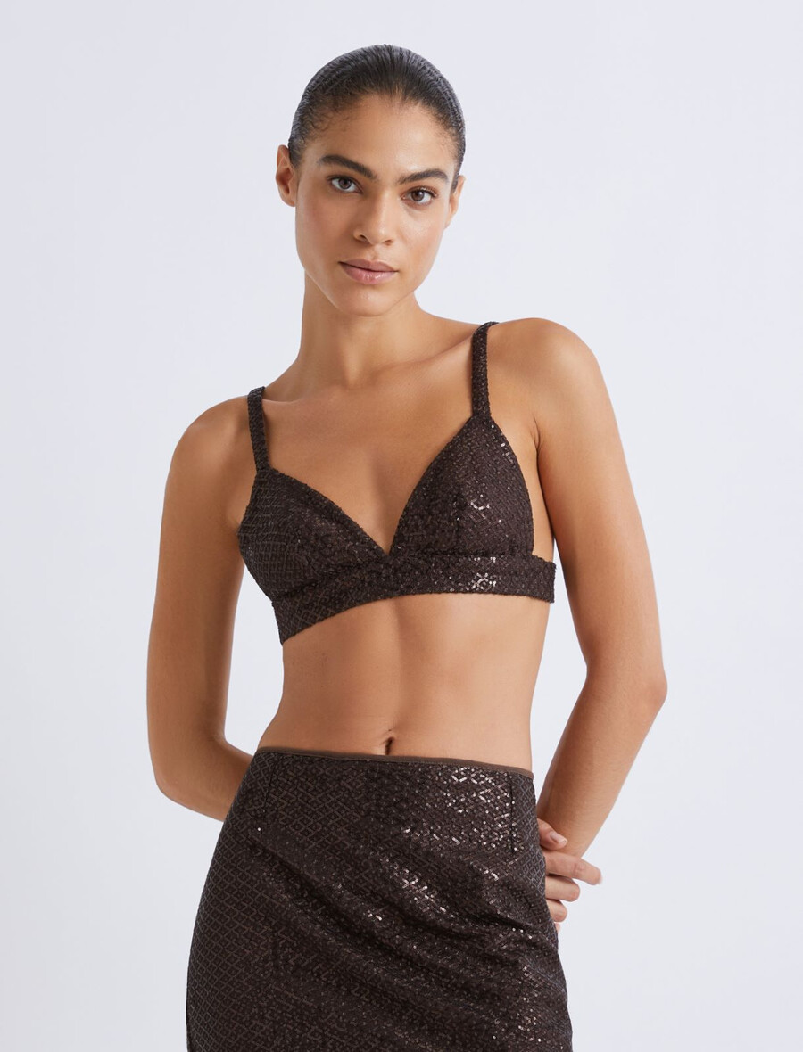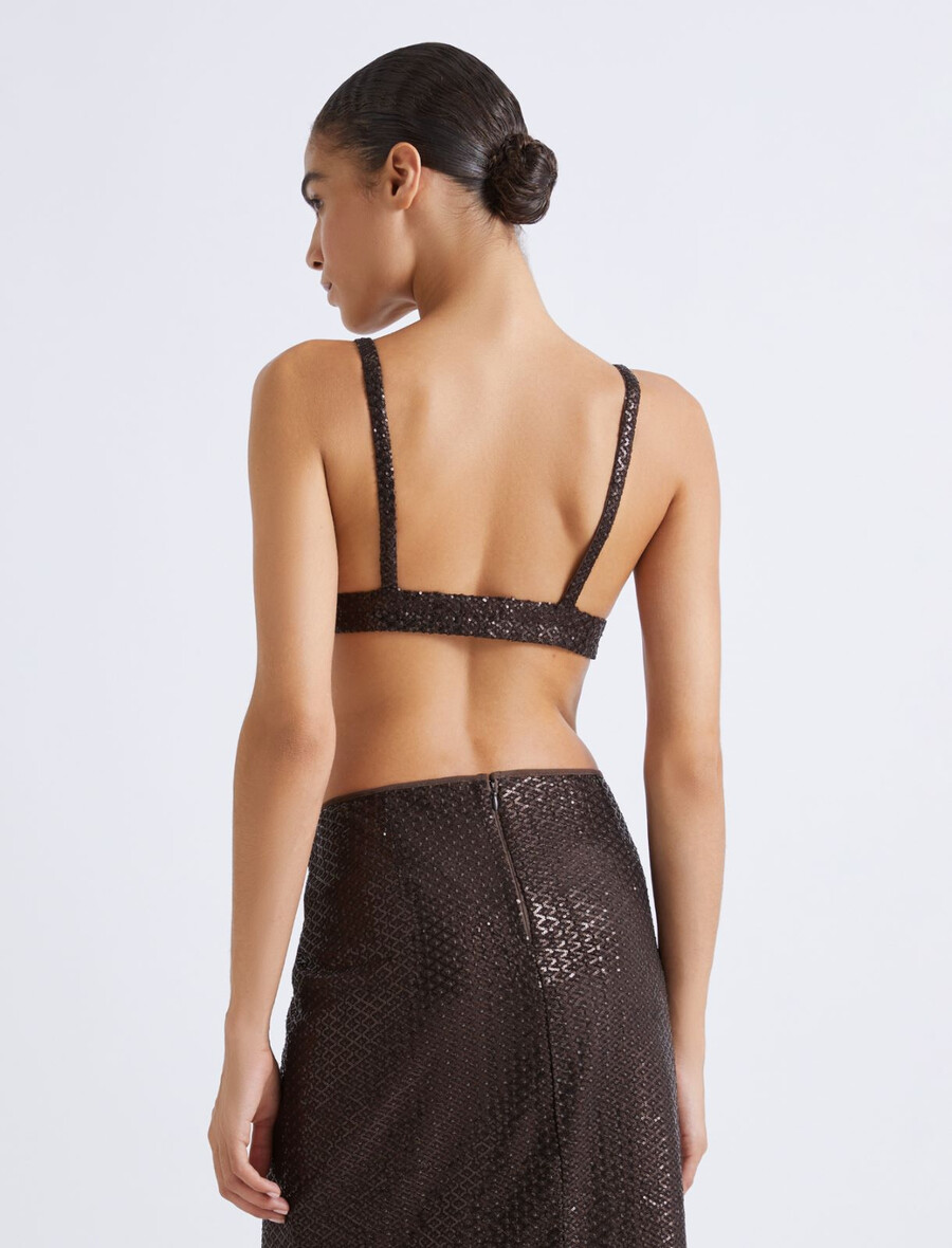 Minimalista, scintillante e decisamente sexy: questo top in tulle ricamato con paillettes attira l’attenzione sulla pelle nuda giocando con tagli vistosi e scollature pronunciate. Abbinalo alla gonna coordinata al polpaccio per un look da sera che catturerà l’attenzione.