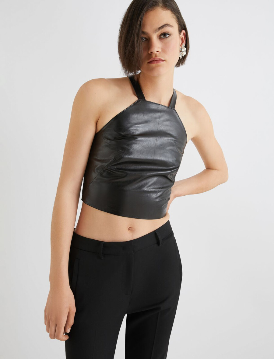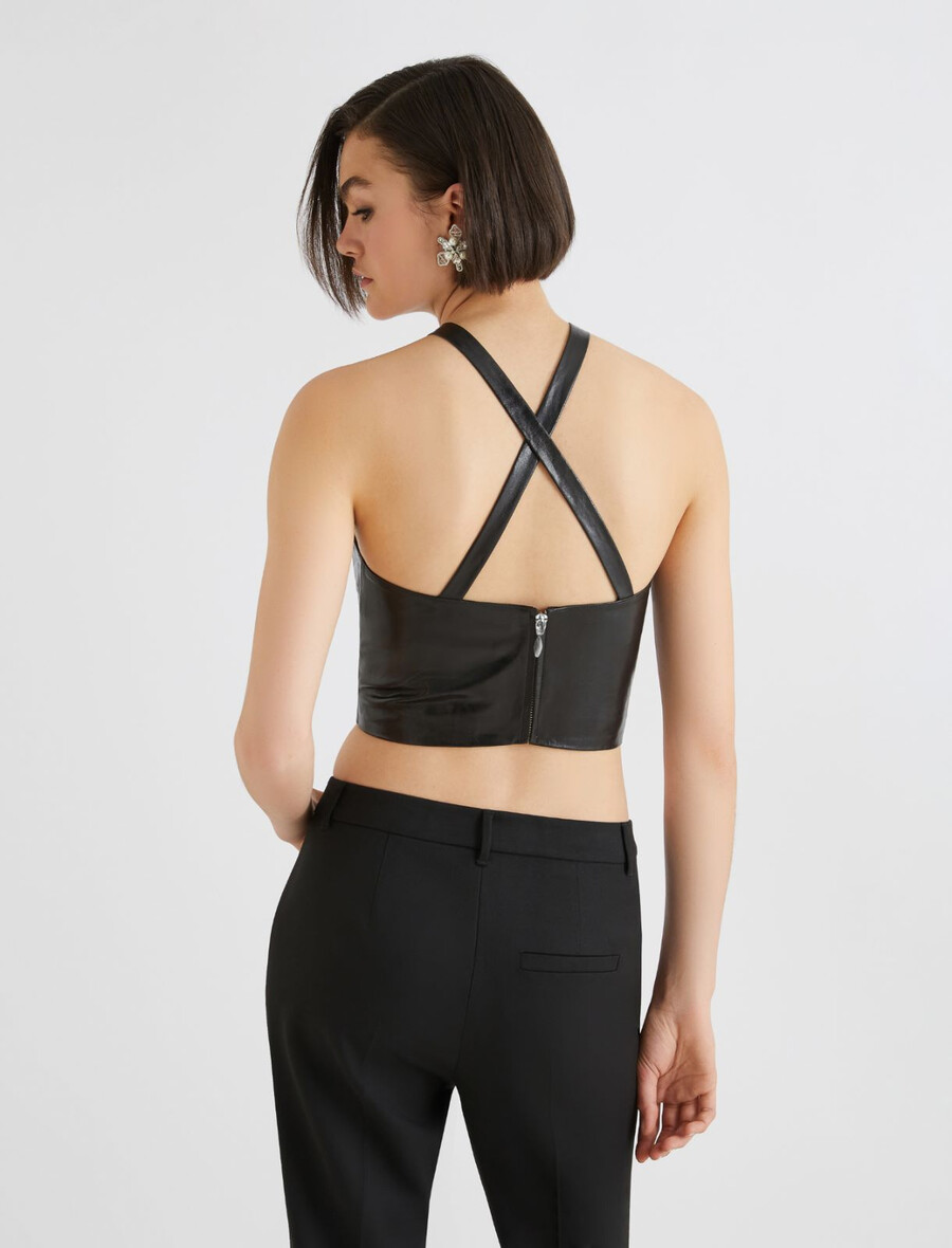 Questo top corto senza maniche in nappa semilucida lascia scoperta l’ombelico e unisce un design pulito a tocchi sensuali. La zip in metallo aggiunge un tocco rock chic.