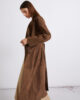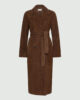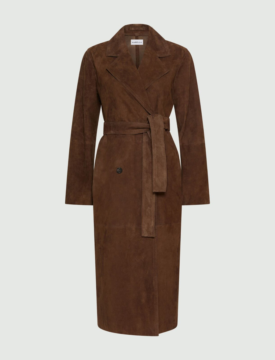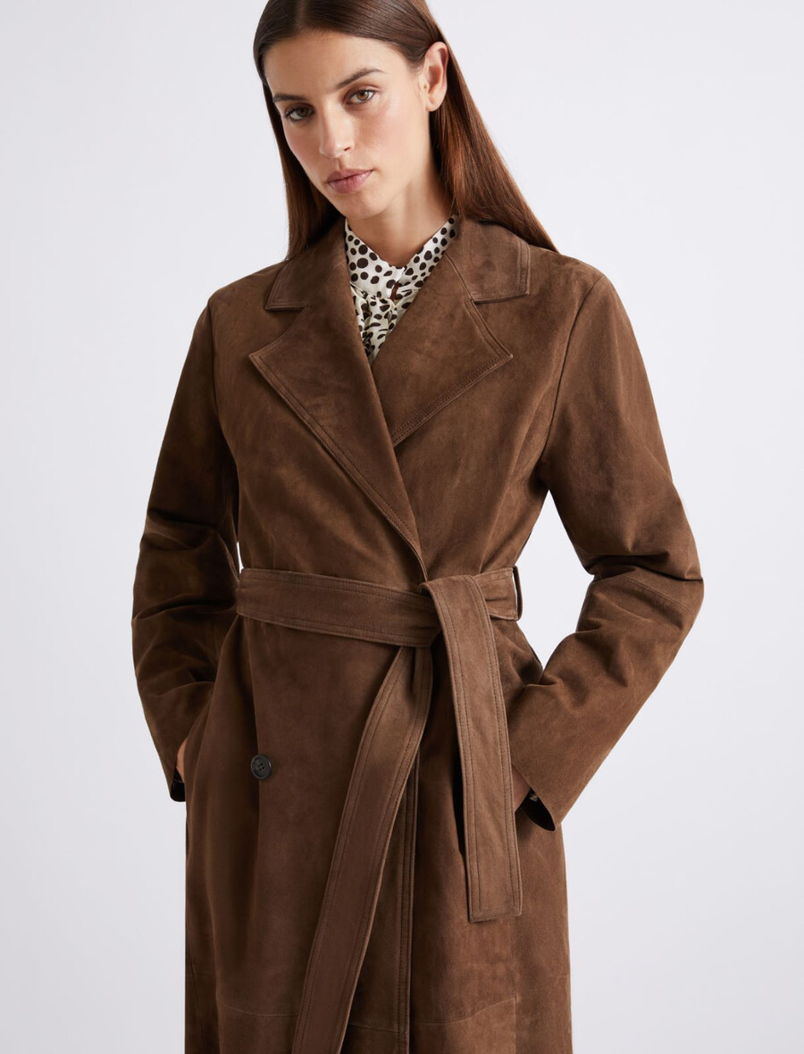 Un’icona di stile in chiave metropolitana: l’elegante e intramontabile trench doppiopetto è proposto in morbida pelle scamosciata. Il modello dalla vestibilità morbida sfiora la figura e può essere regolato a piacere grazie alla cintura abbinata.